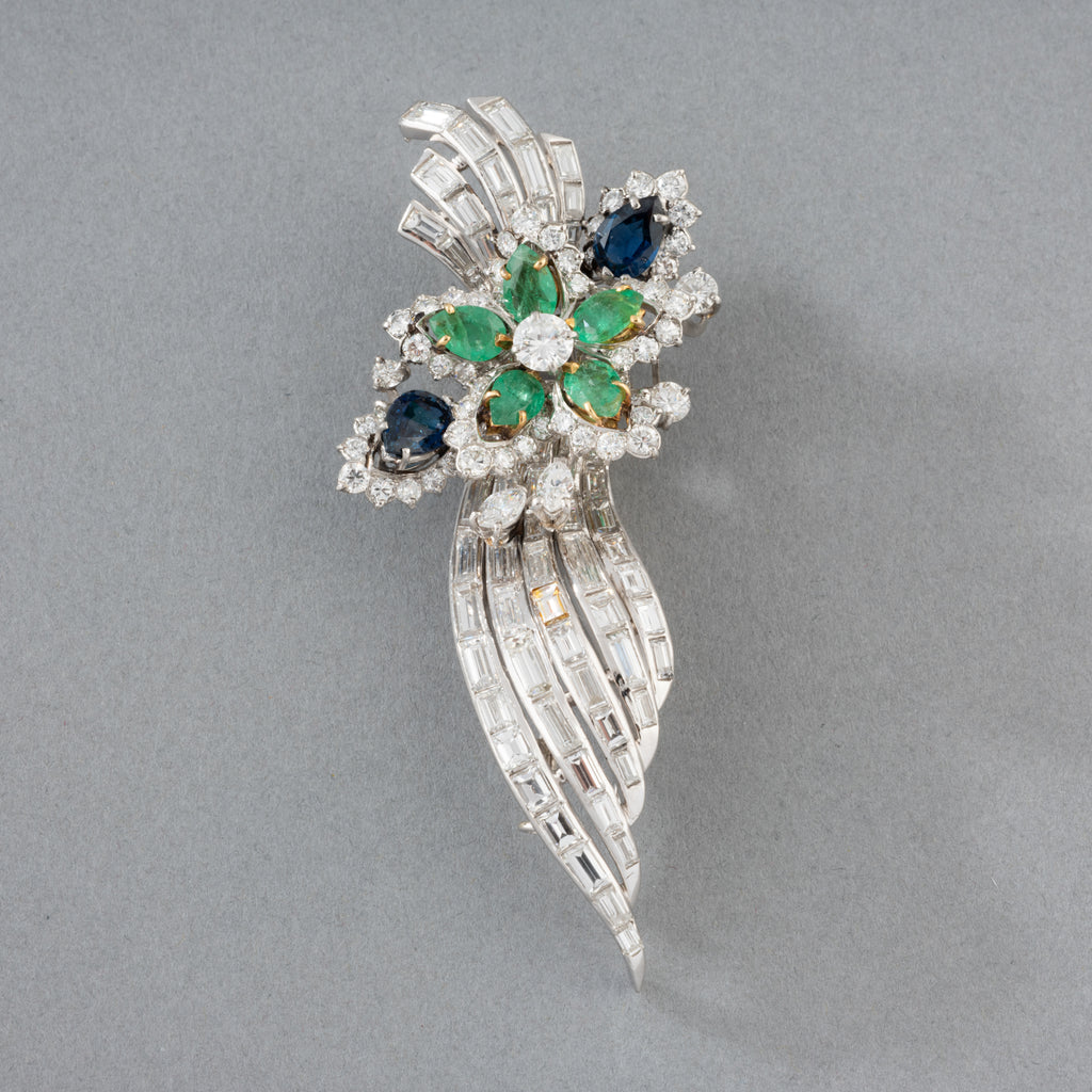 Diamonds Emeralds and Sapphires French Vintage Brooch