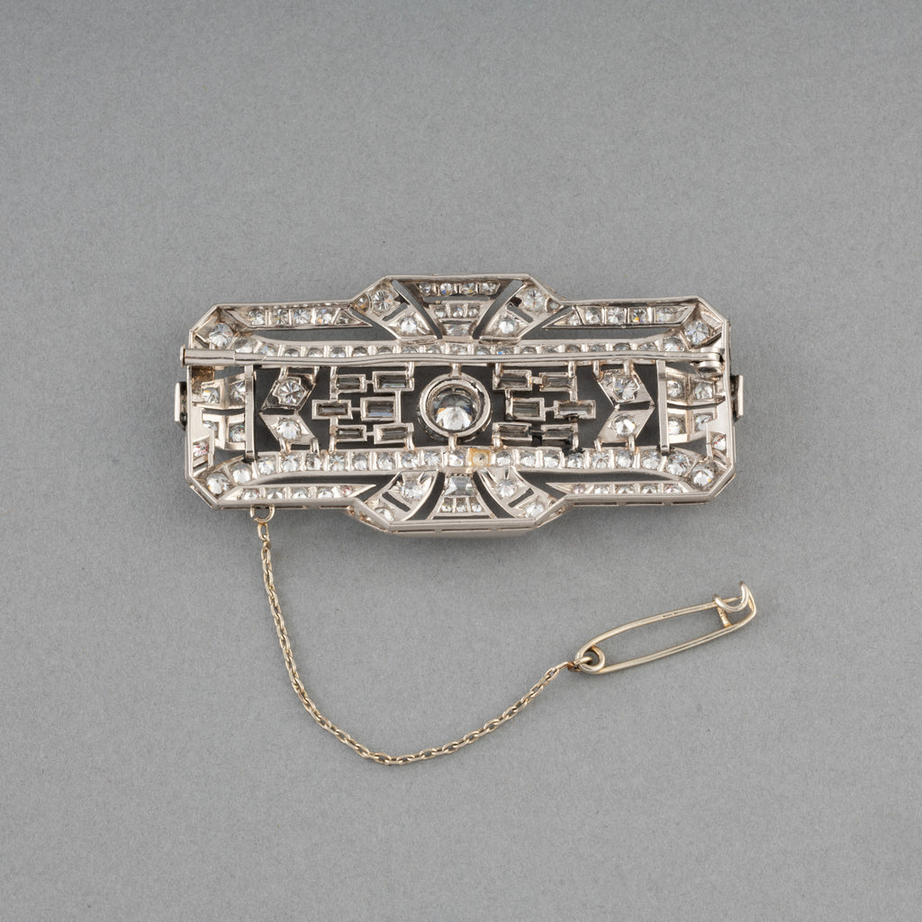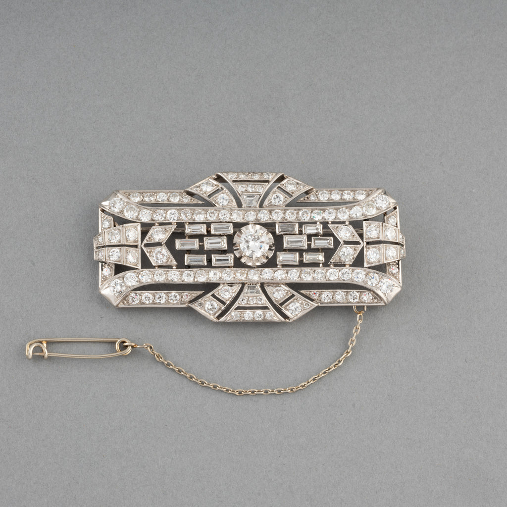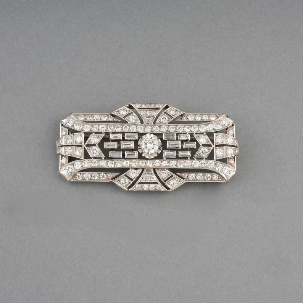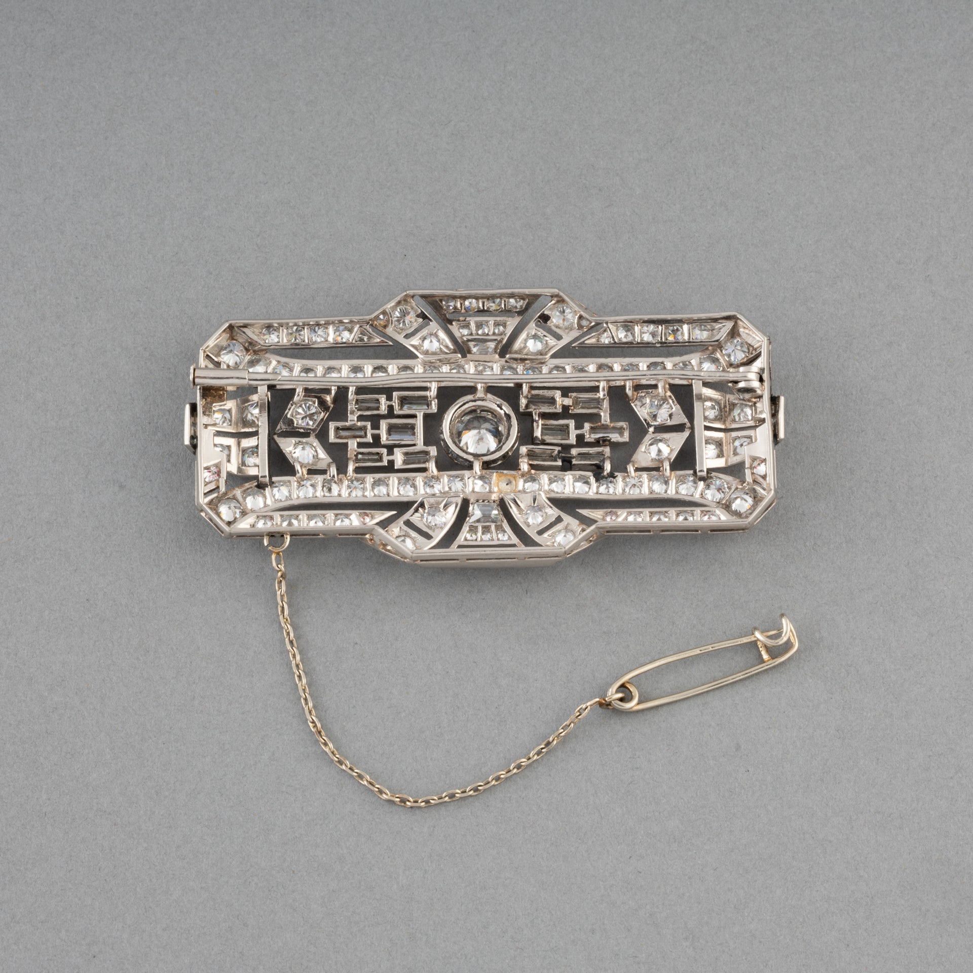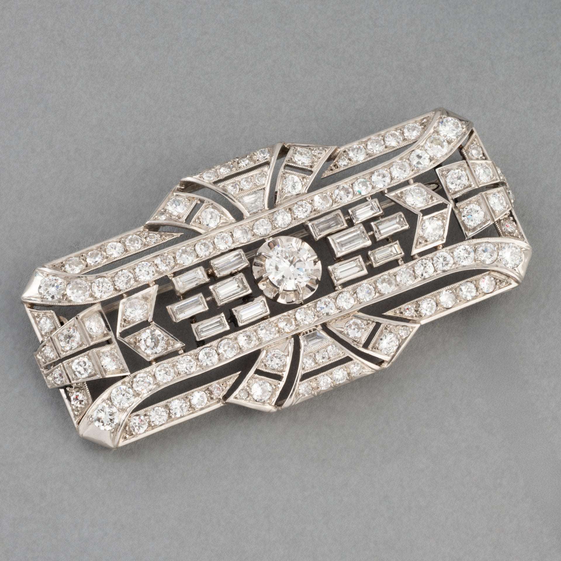 Made in platinum and set with approximately 9 carts of quality diamonds. The bigger one weights approximately 1 carat. The quality is good, the diamonds are white with good clarity.