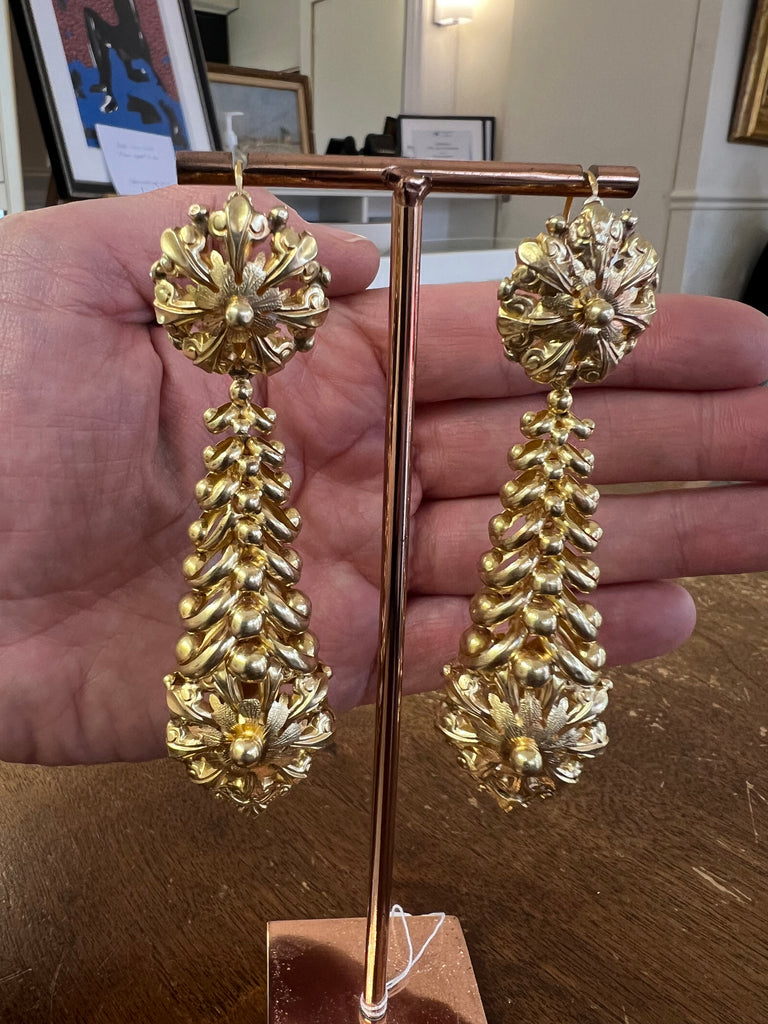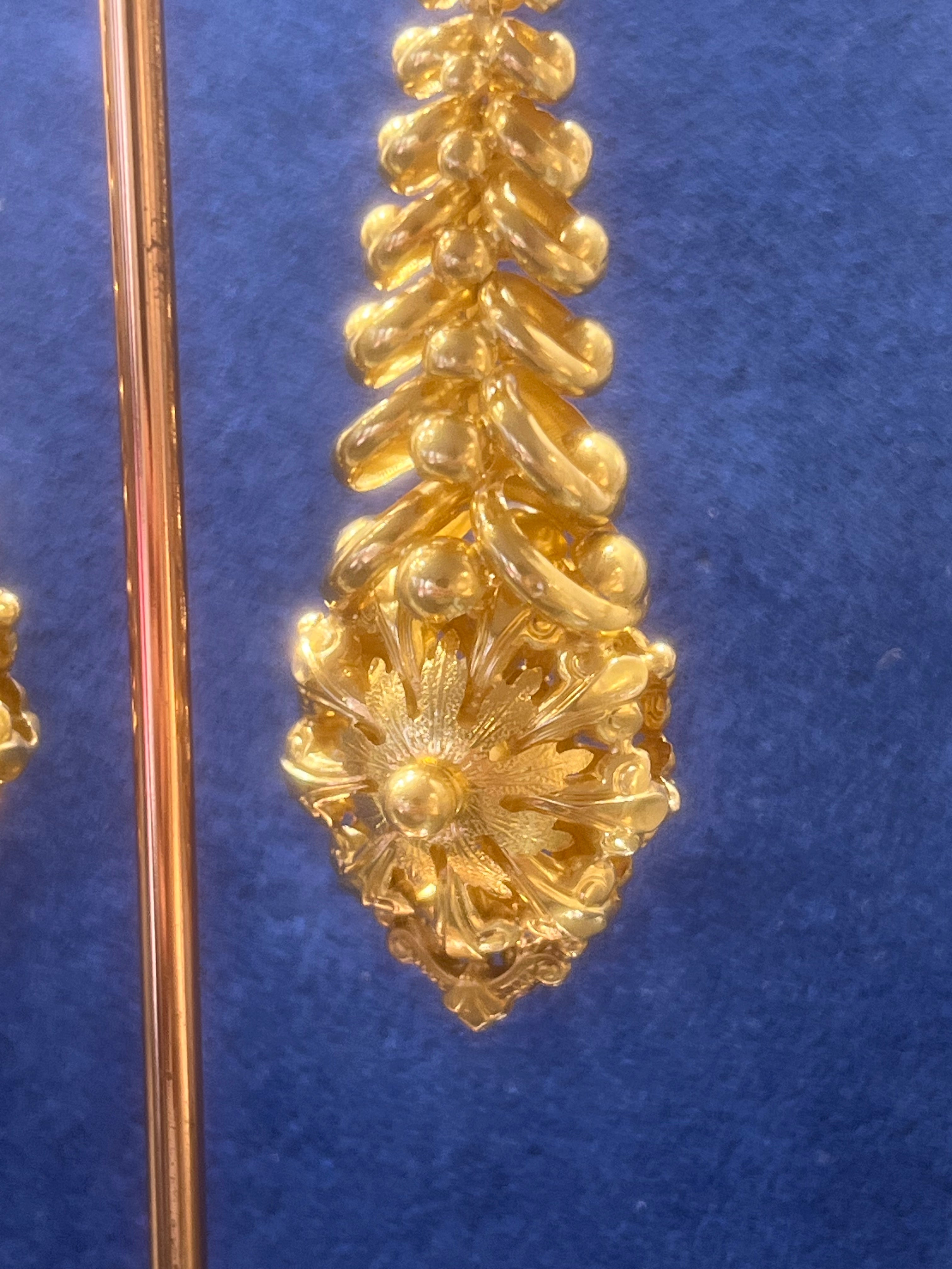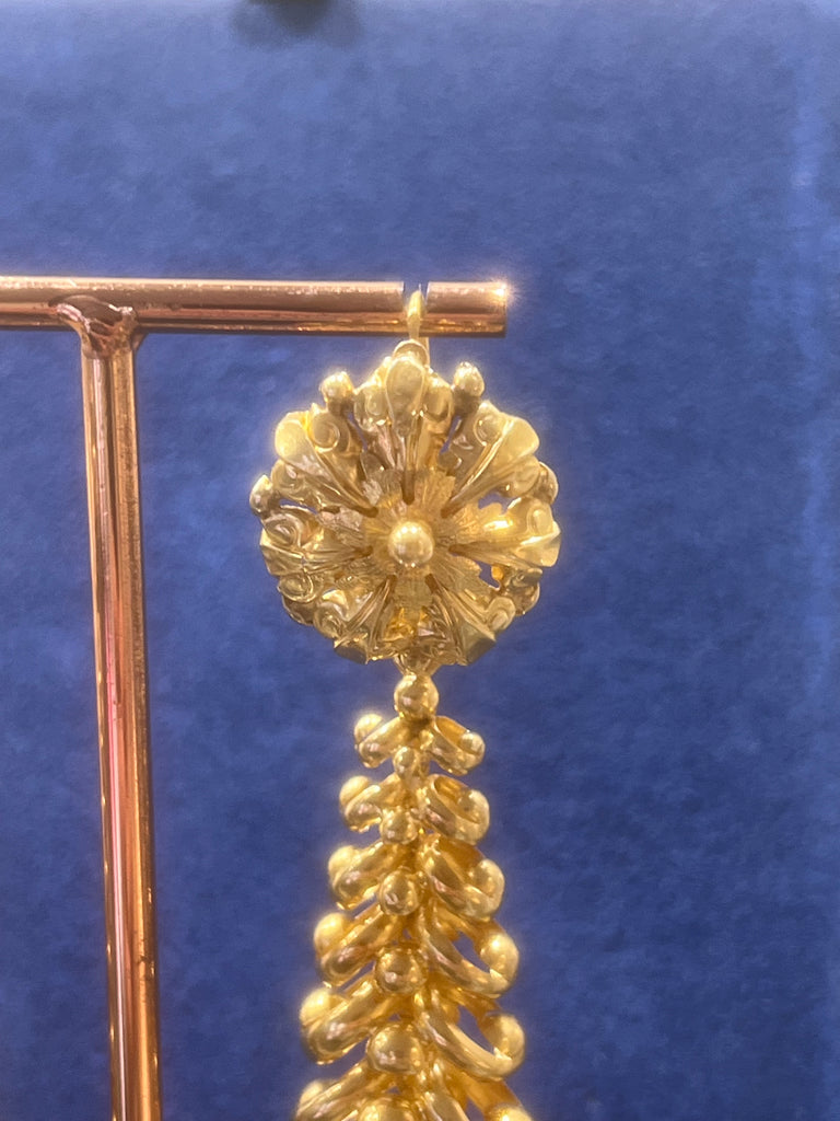 An amazing pair of pendant earrings, French made circa 1830. Made in yellow gold 18k, they are very spectacular, with a very well craftsmanship.