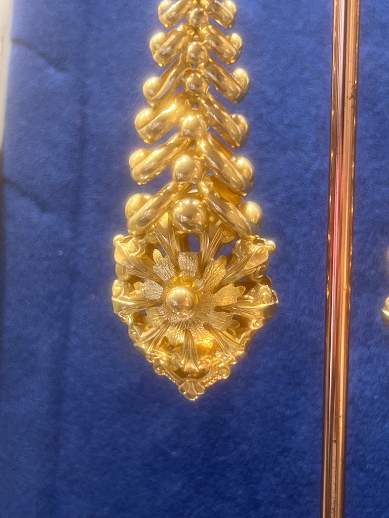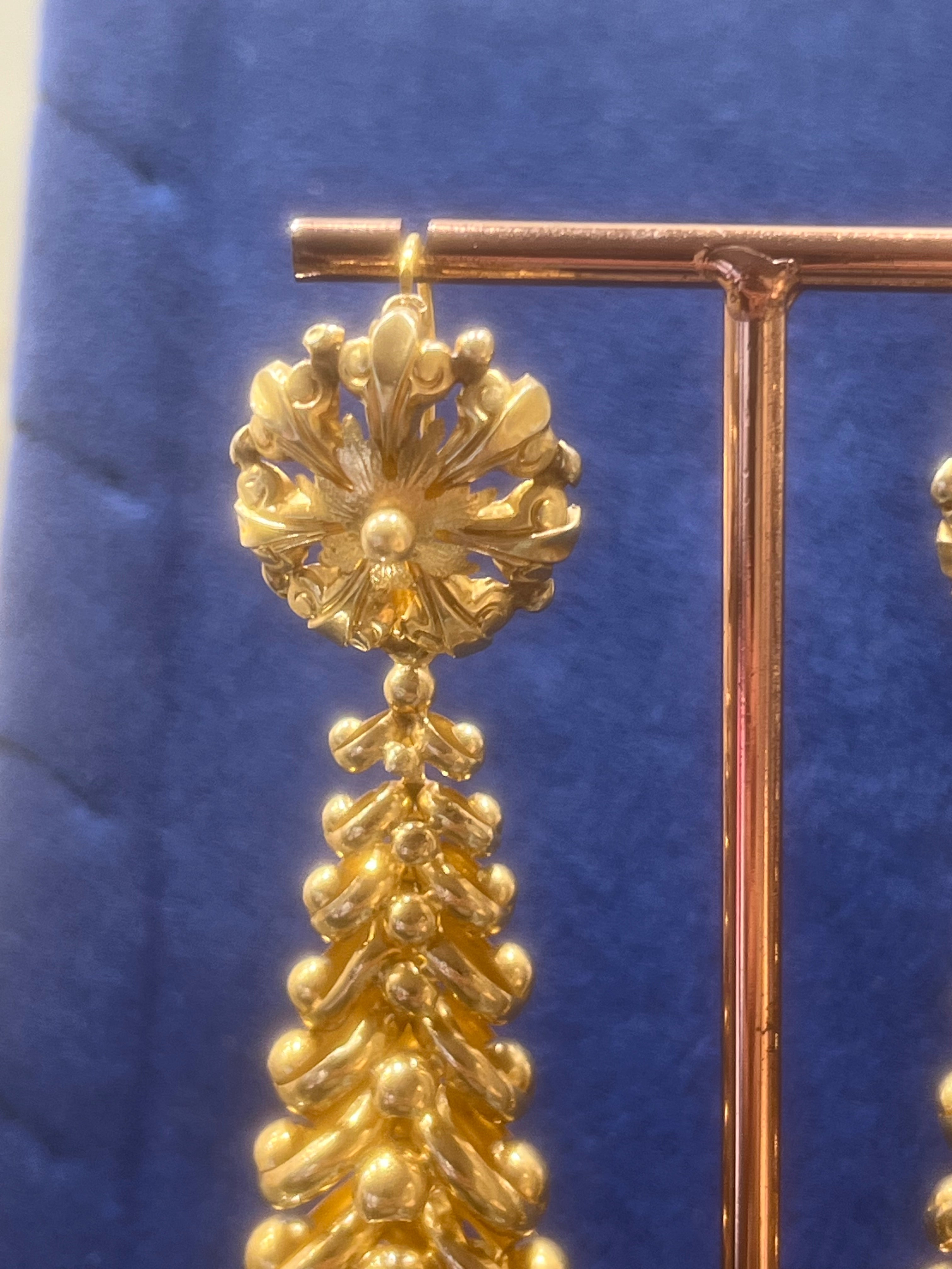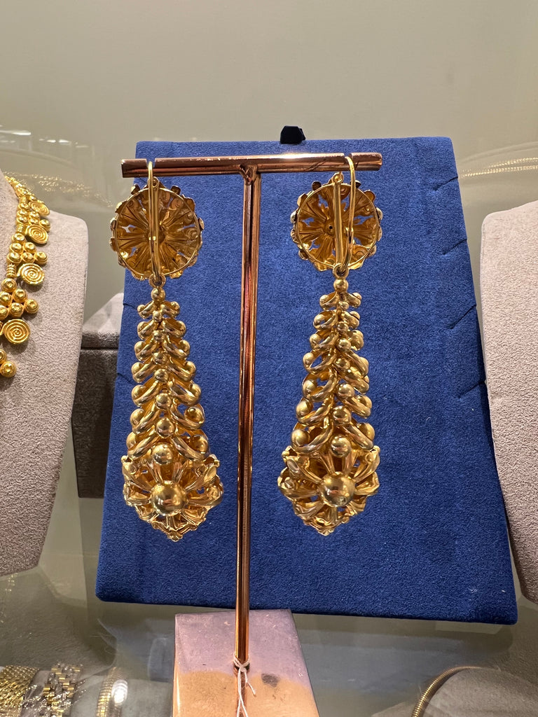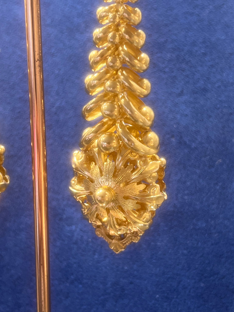 An amazing pair of pendant earrings, French made circa 1830. Made in yellow gold 18k, they are very spectacular, with a very well craftsmanship.