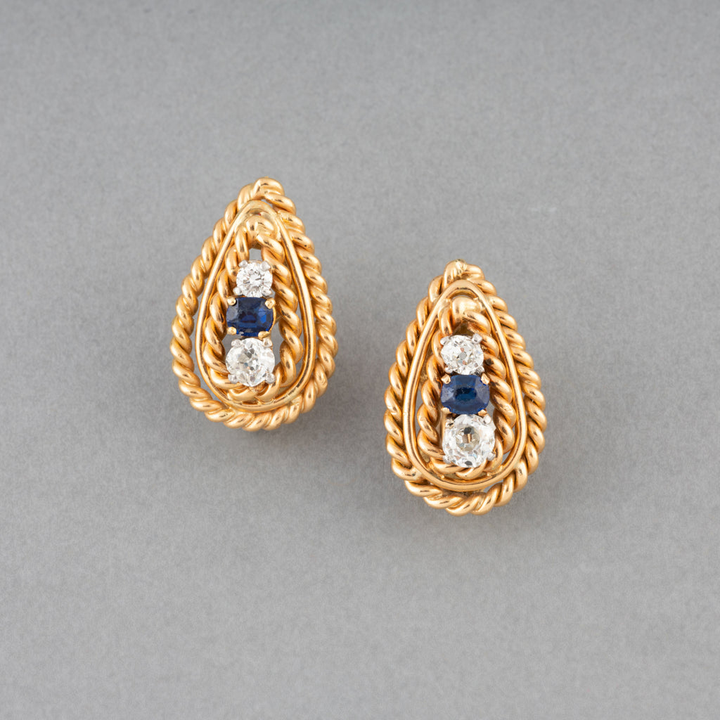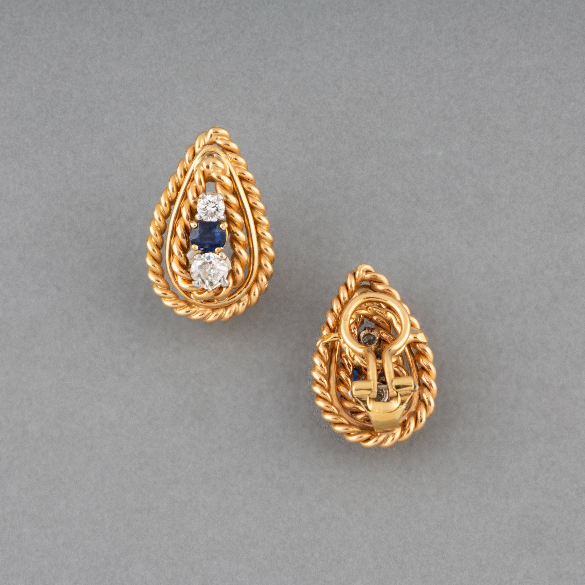 A lovely pair of vintage earrings, made circa 1960. Made in yellow gold 18k, set with diamonds and sapphires.