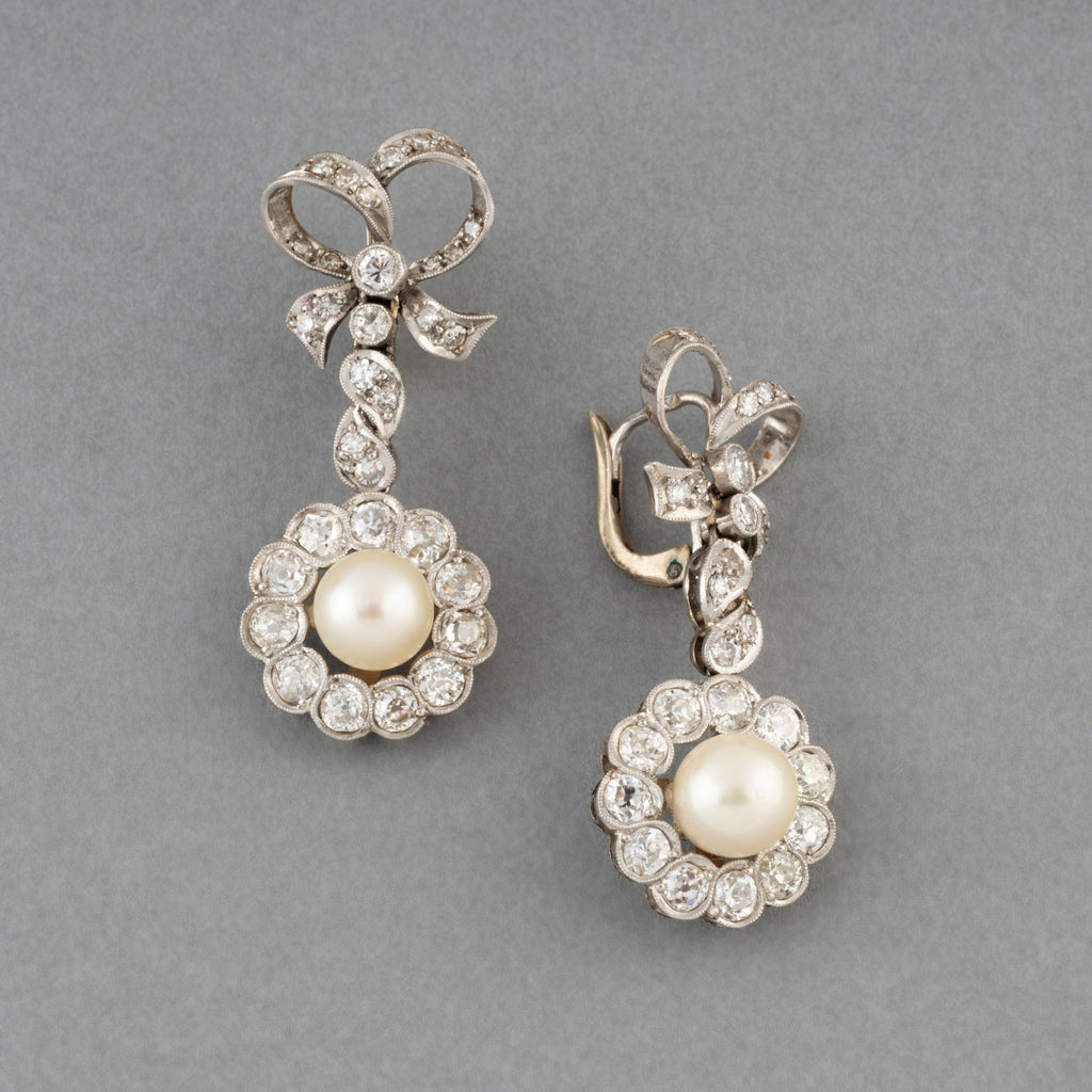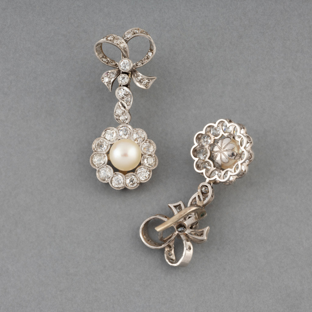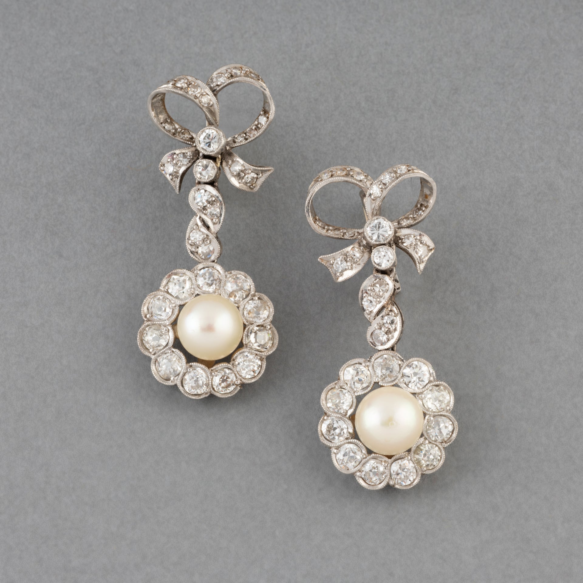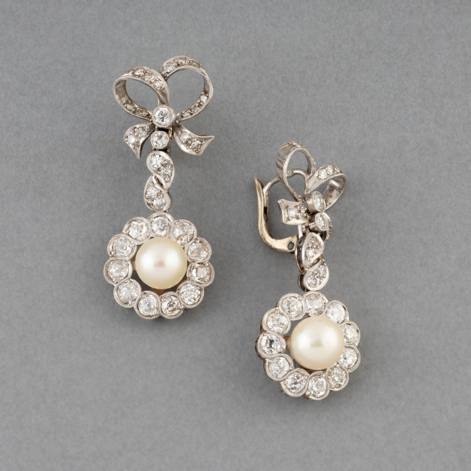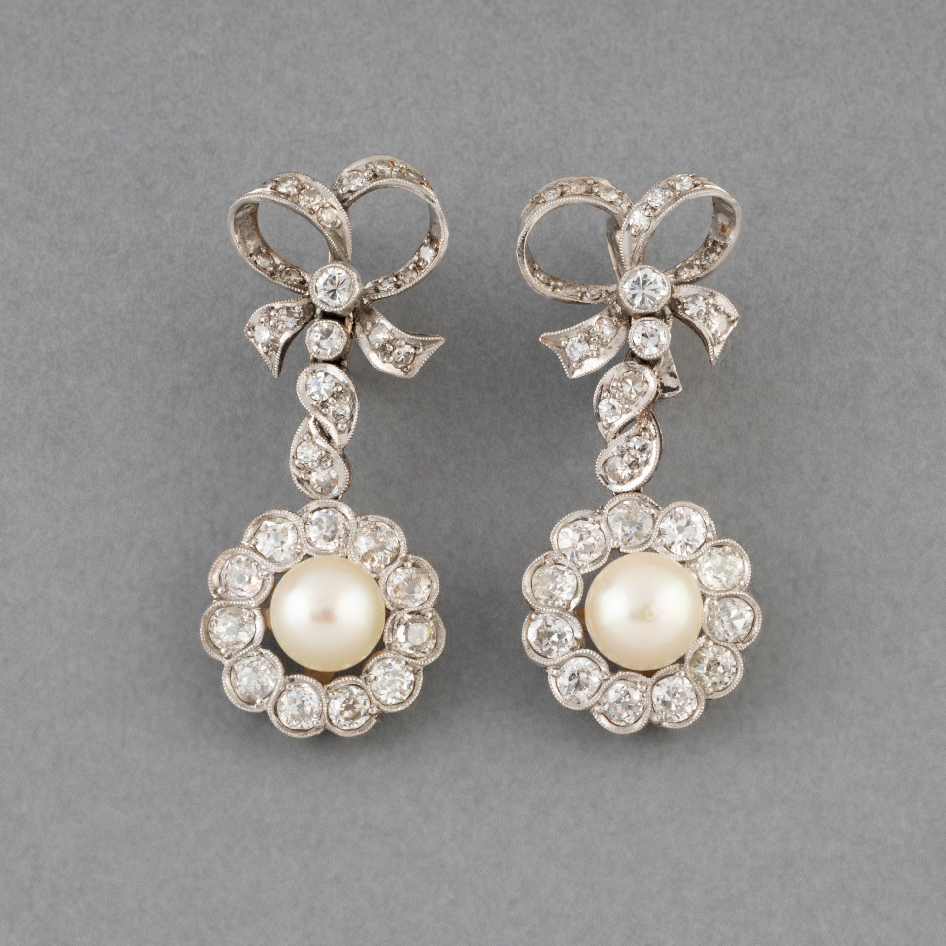 An elegant pair of earrings, European made circa 1910. Made in white gold 18k, set with approximately 1.50 carats of Old European cut diamonds. Set with two pearls of 8mm diameter.