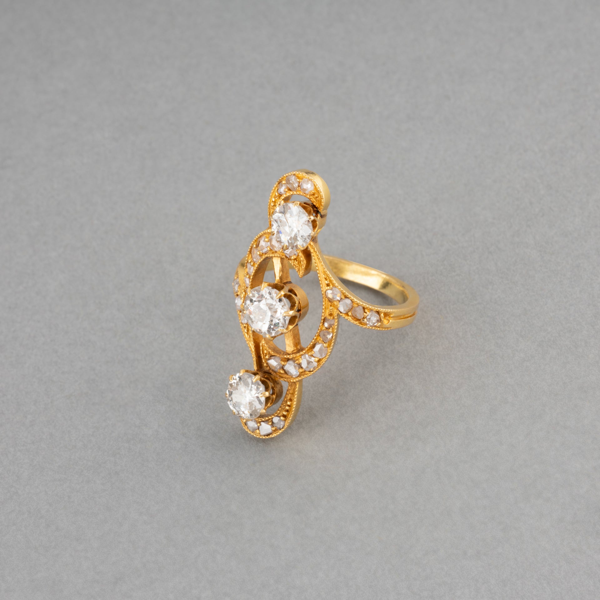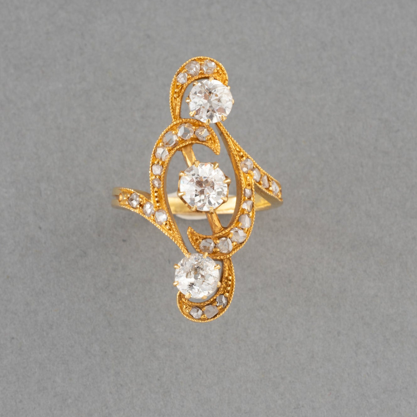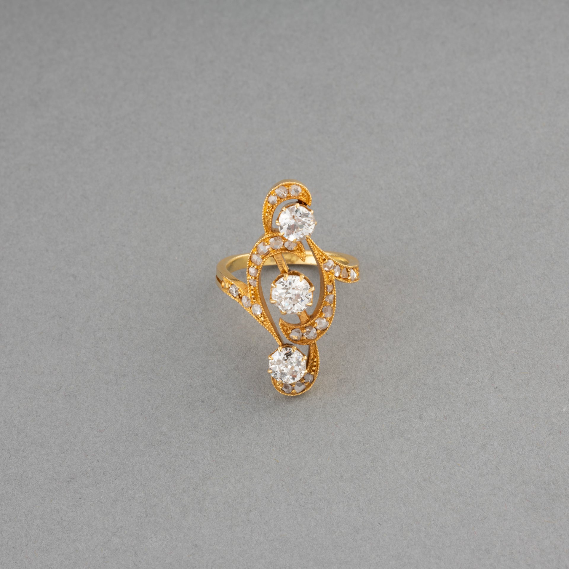 Made in yellow gold 18k. Set with three Old European cut diamonds that weights approximately 0.30/0.30/0.40 each.