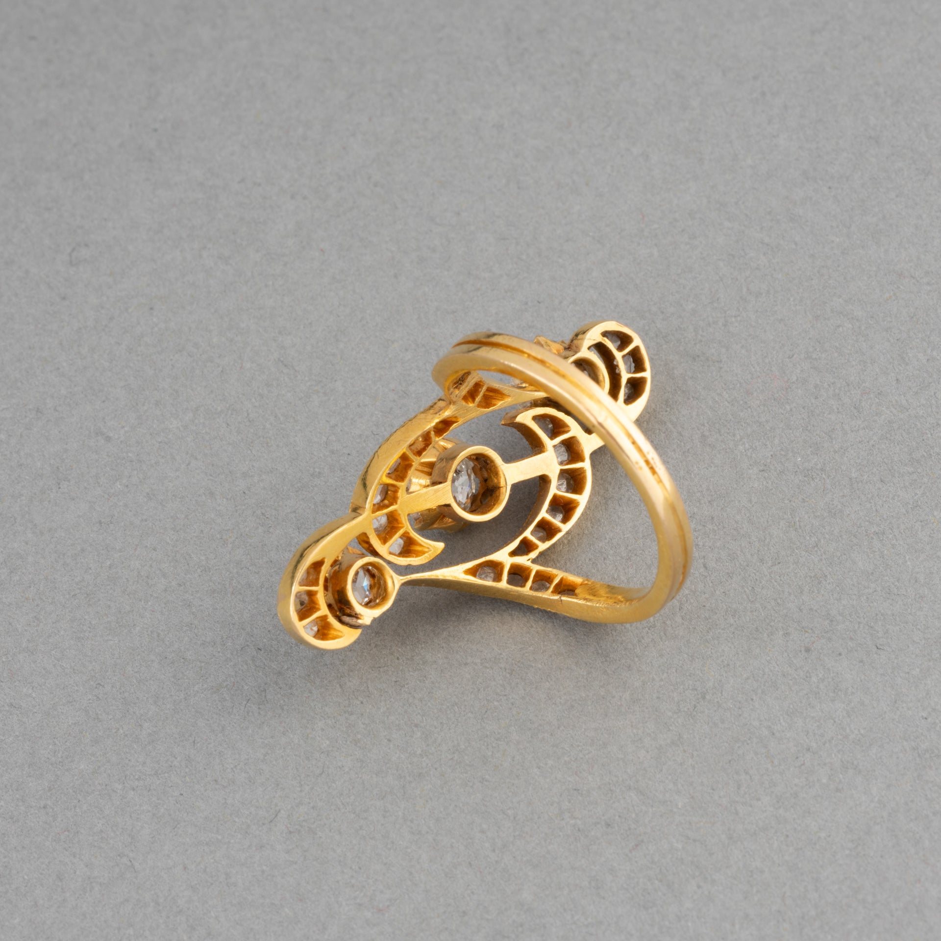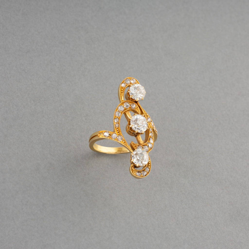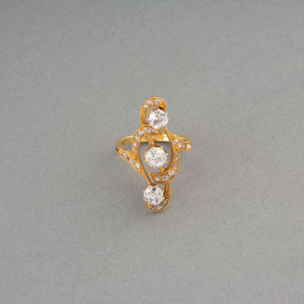 Made in yellow gold 18k. Set with three Old European cut diamonds that weights approximately 0.30/0.30/0.40 each.