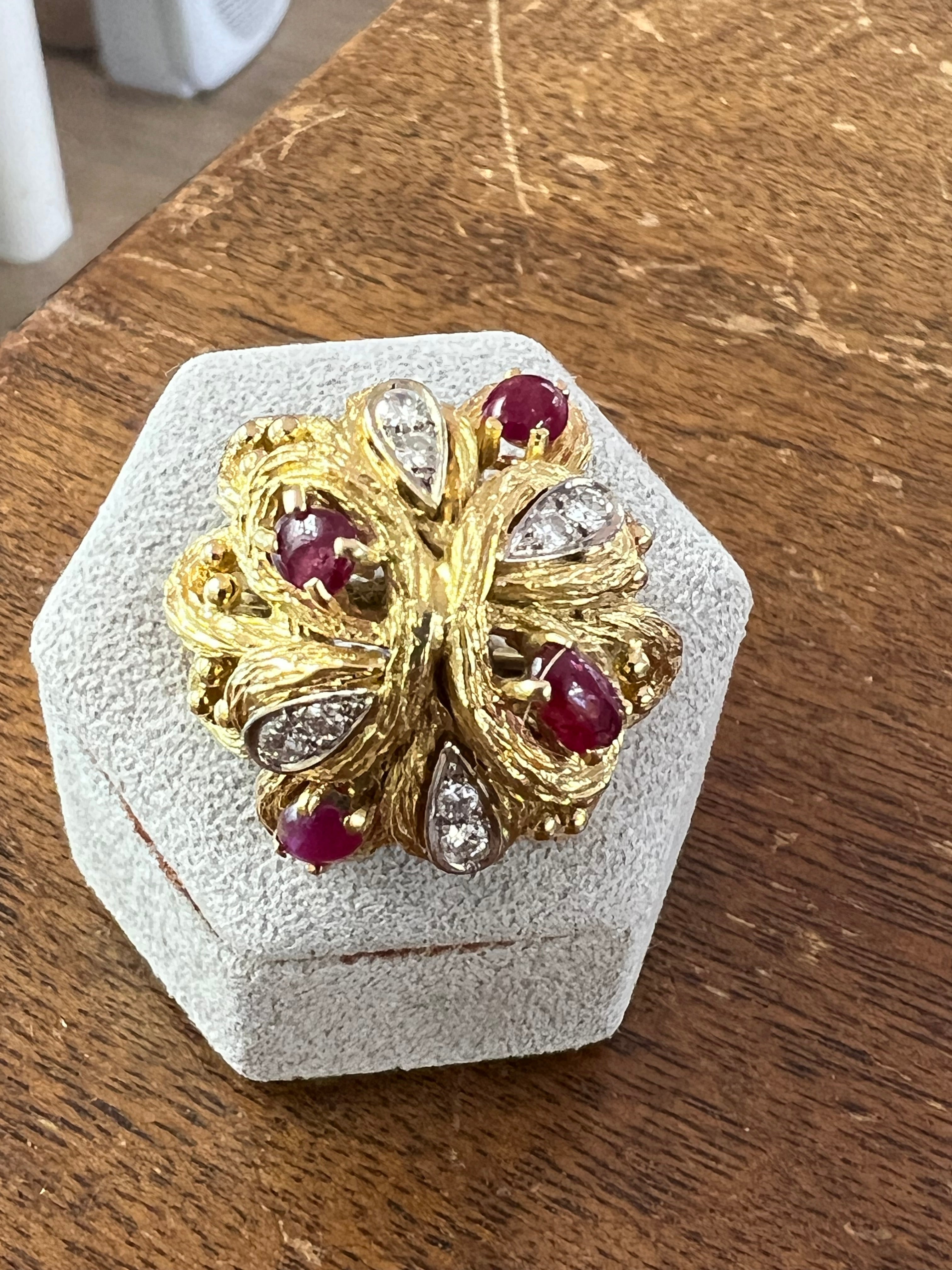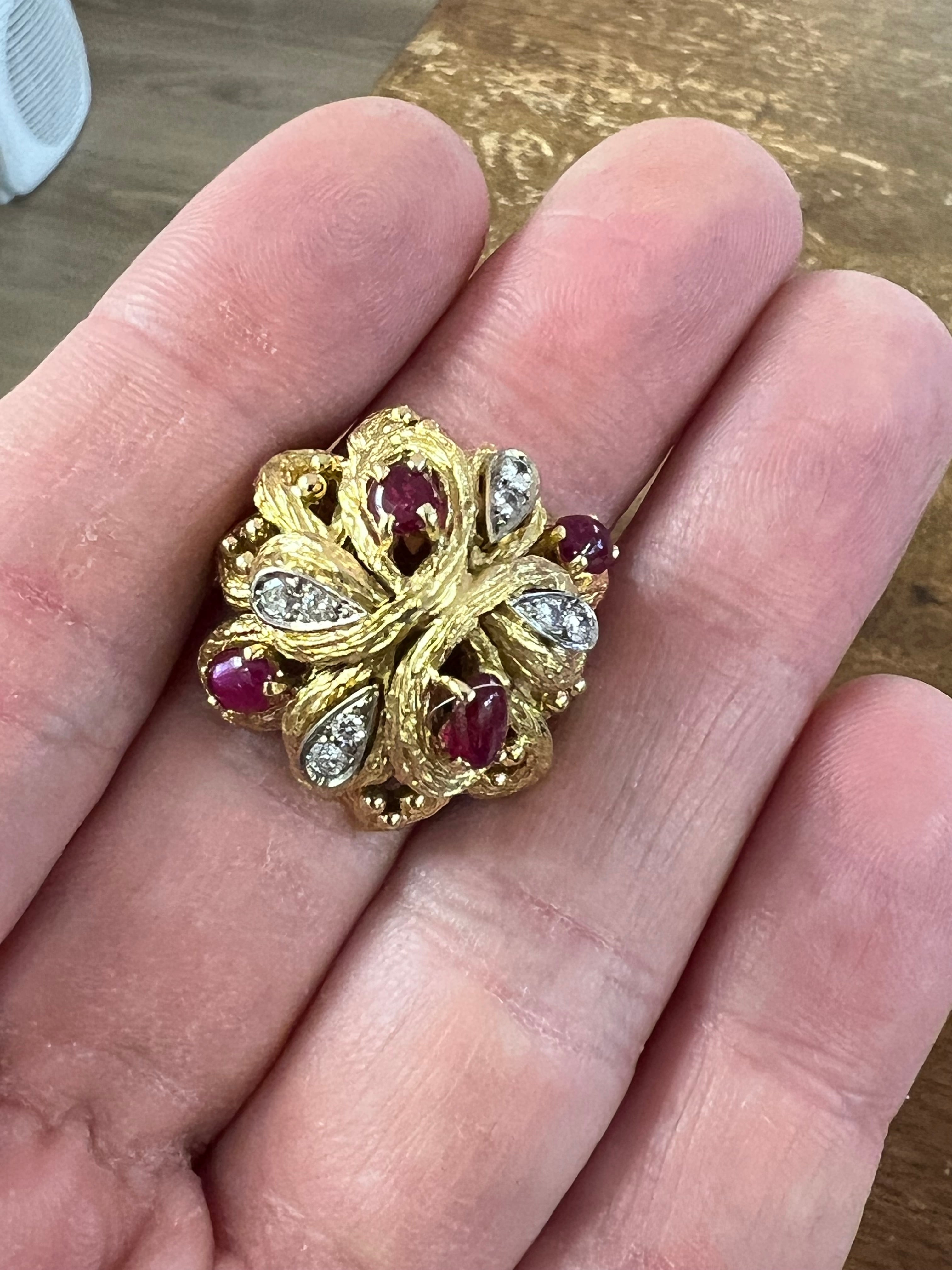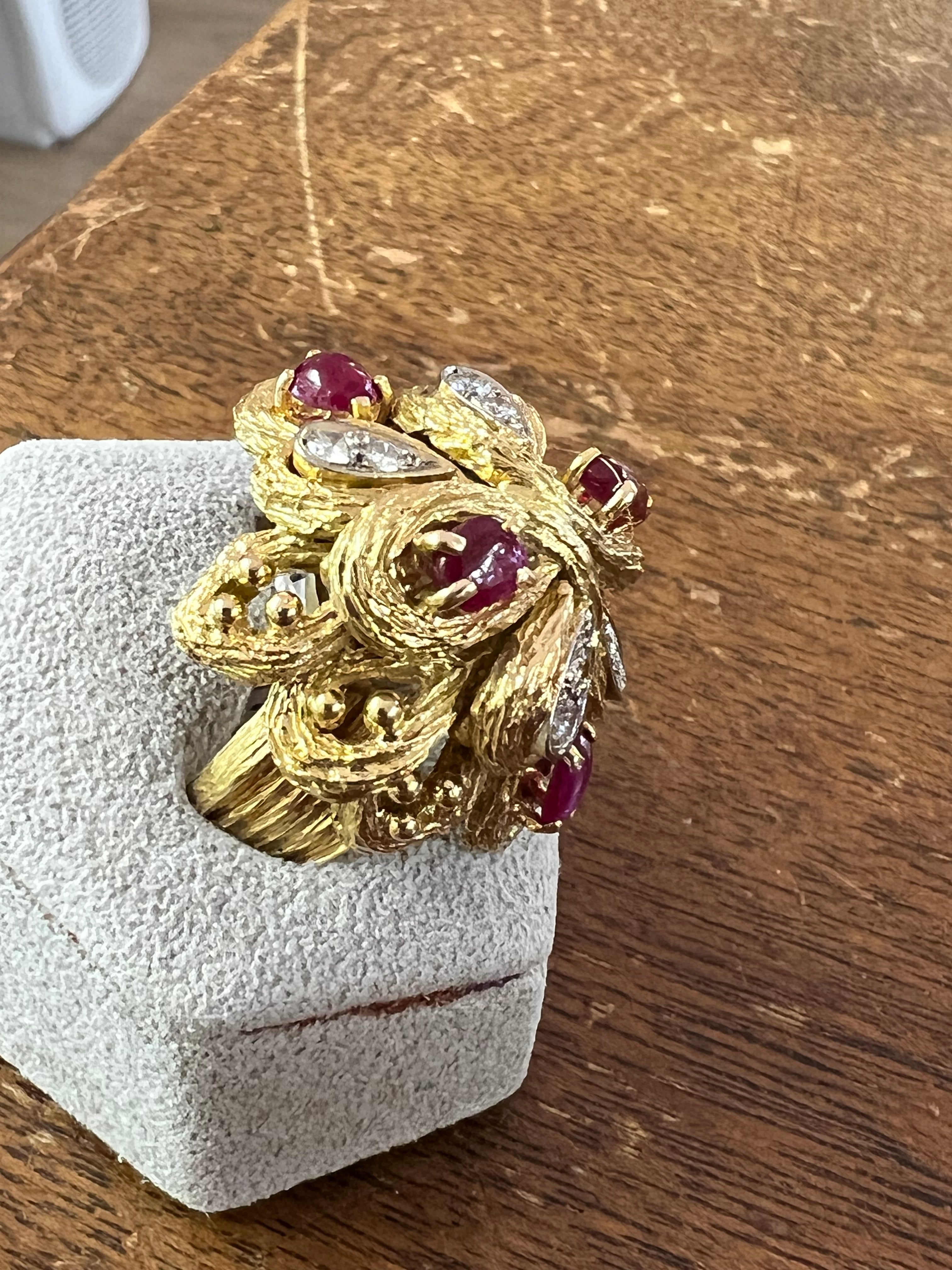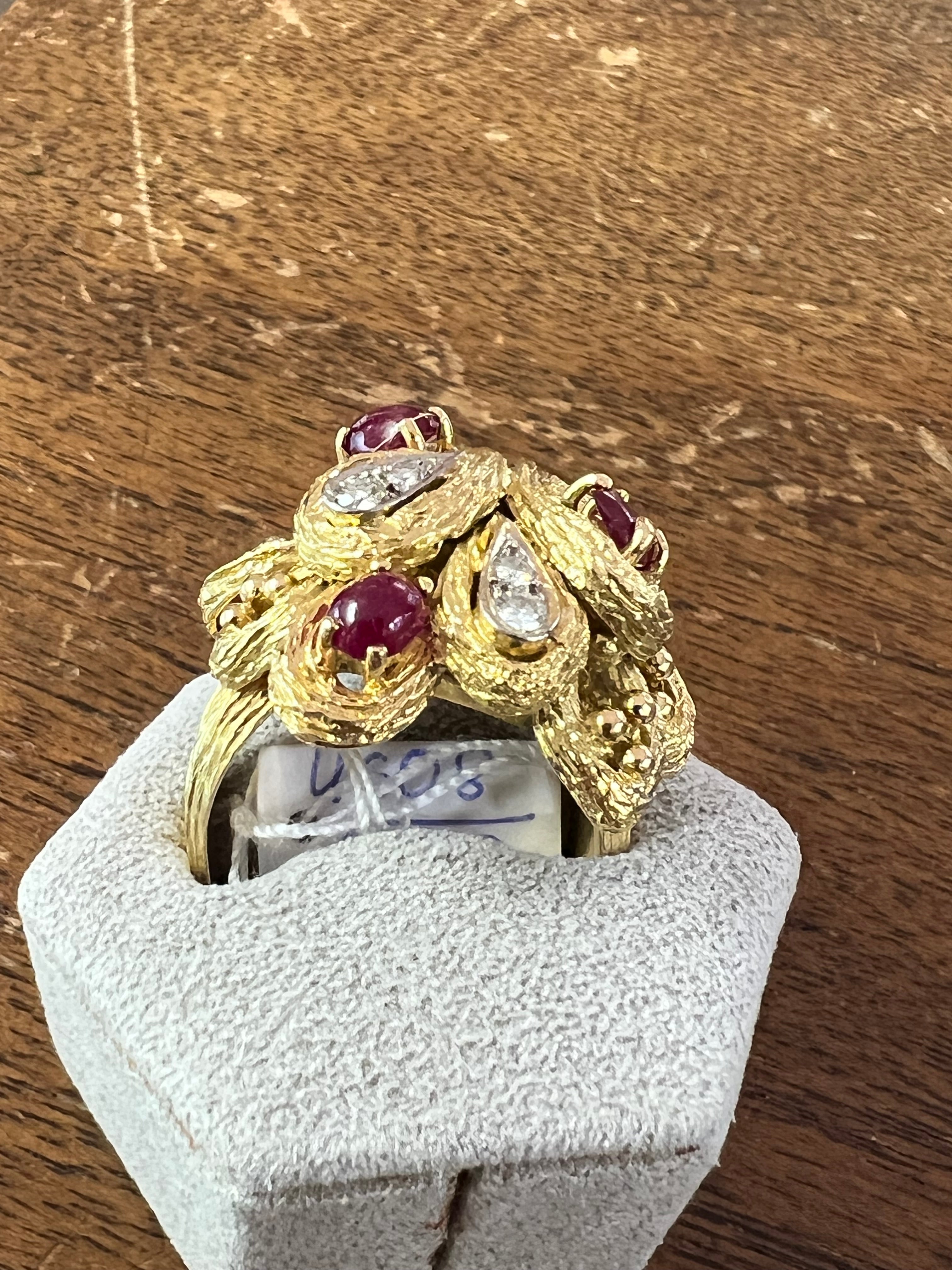 A very lovely ring, French vintage made. Made in yellow gold 18k, set with diamonds and rubies cabochons.