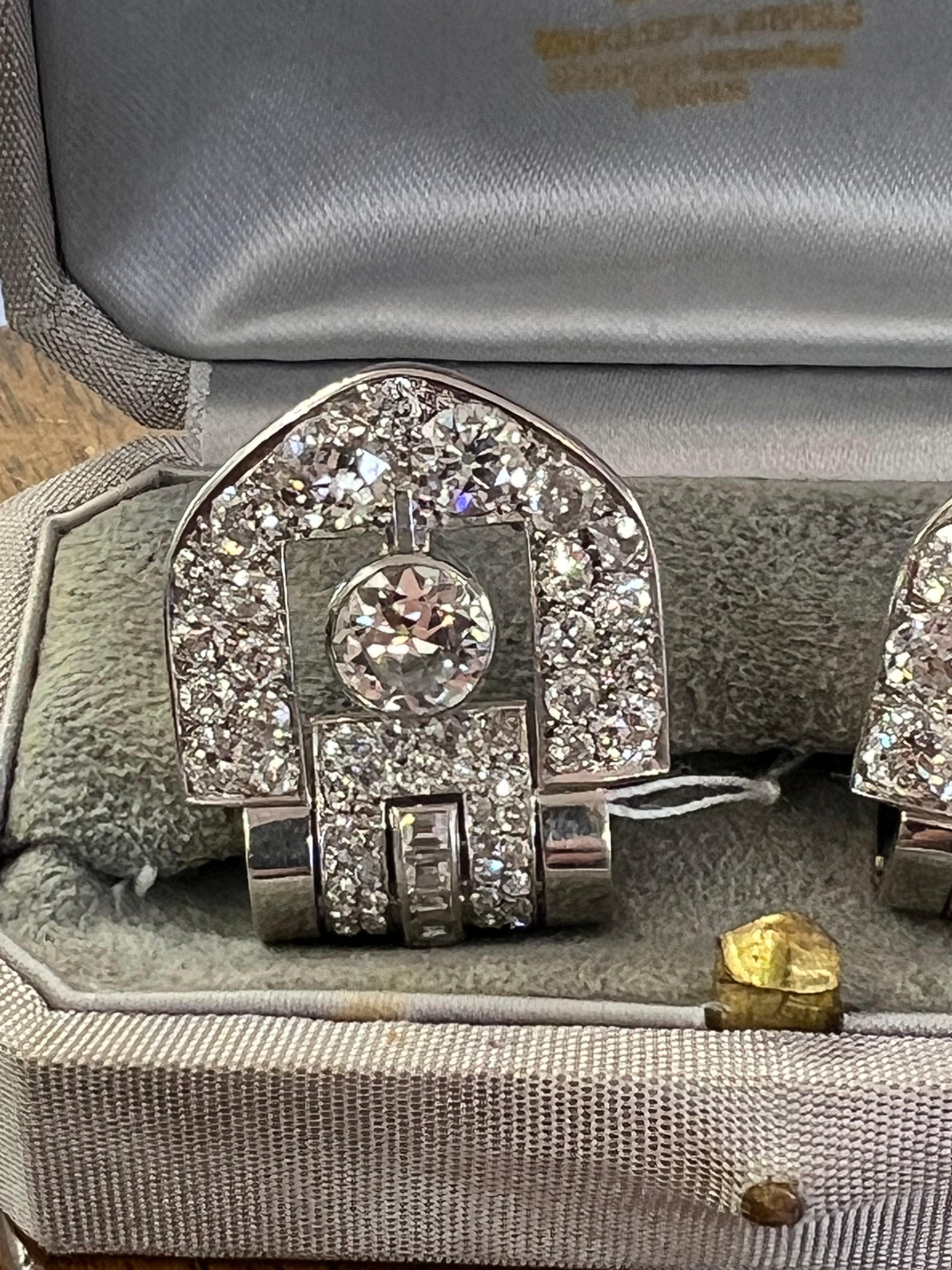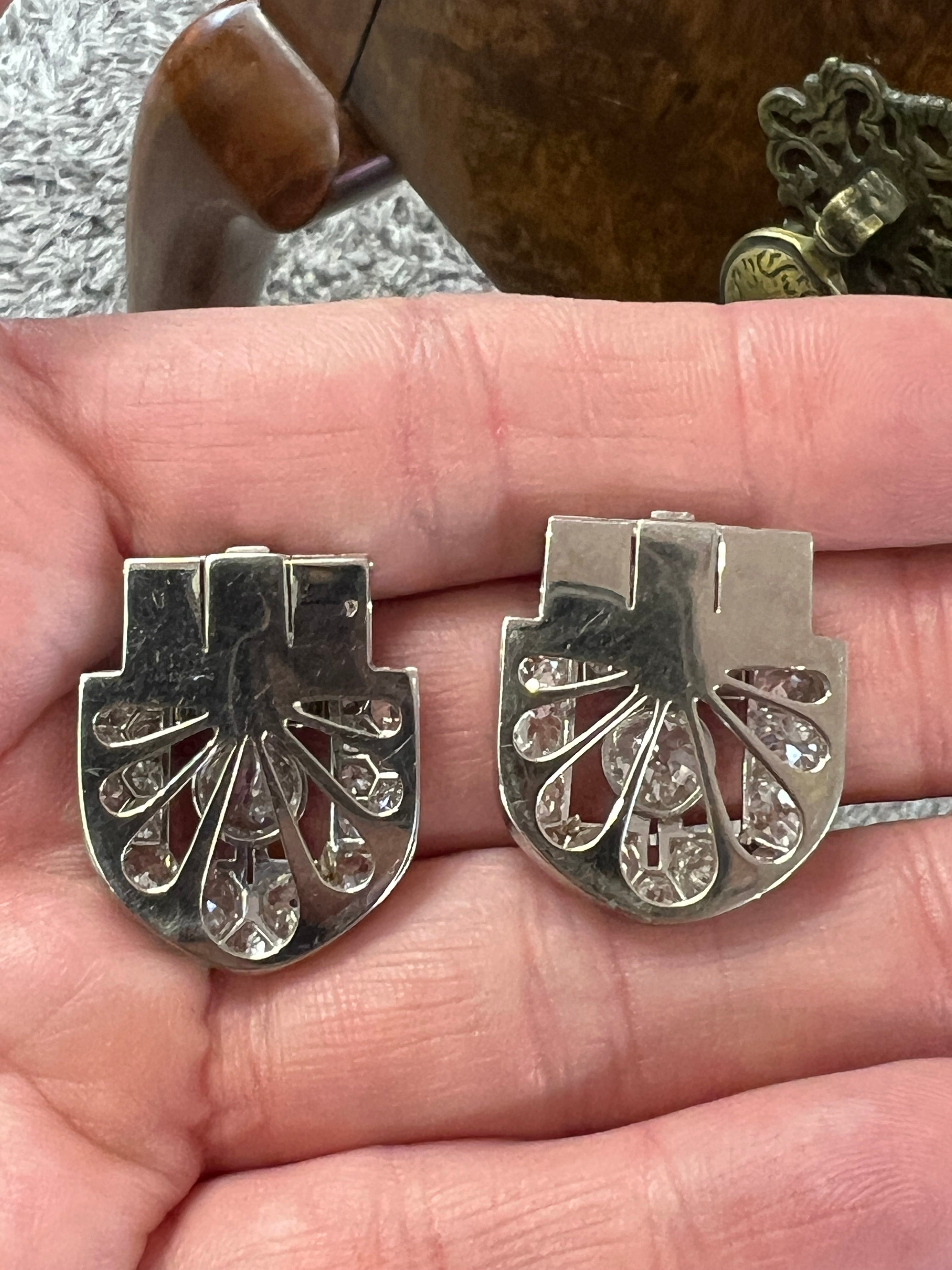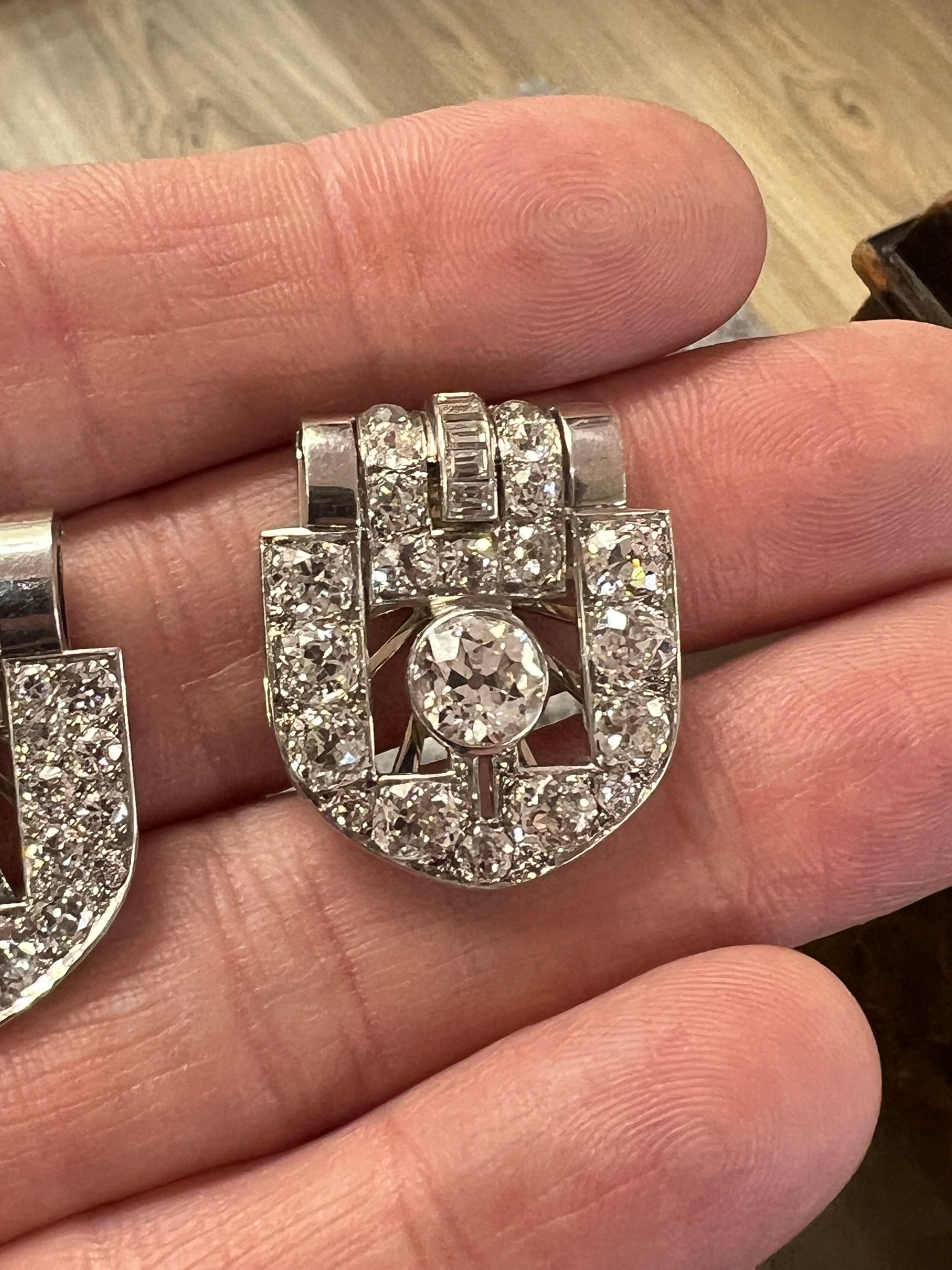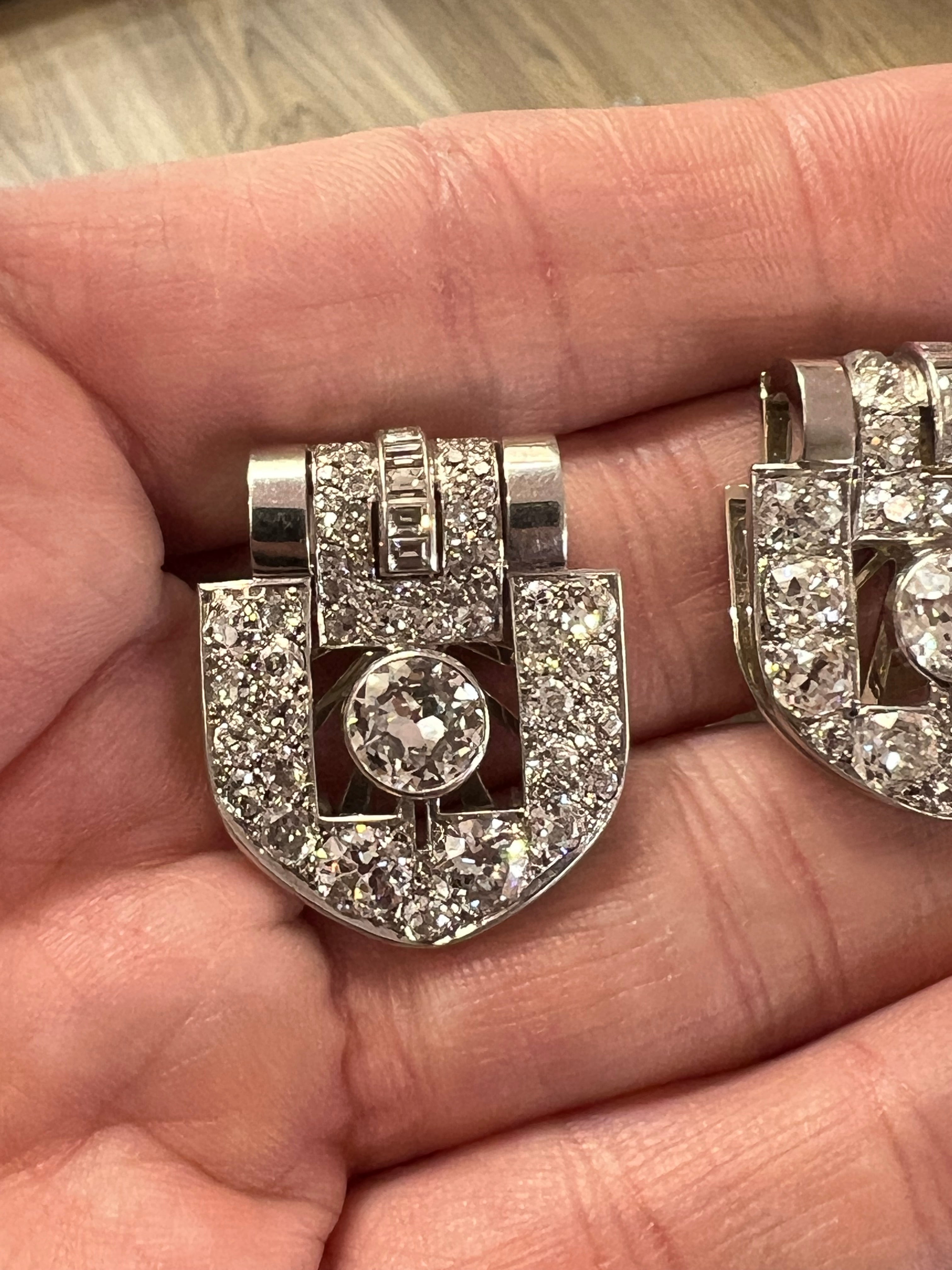 A very beautiful pair of clip brooches, French made circa 1930. Made in platinum and set with approximately 11 Carats diamonds. (6.5+5.5 carats each).