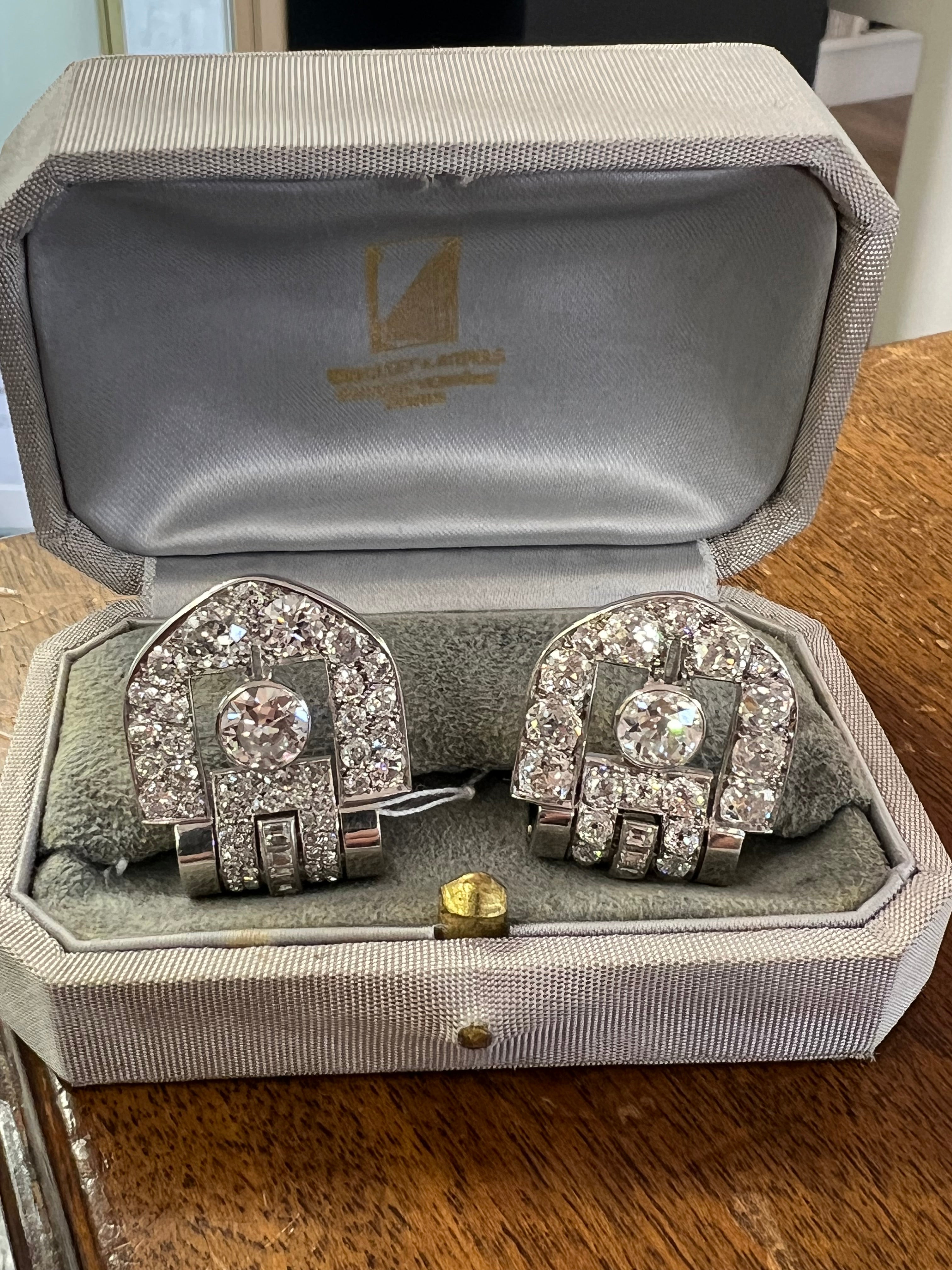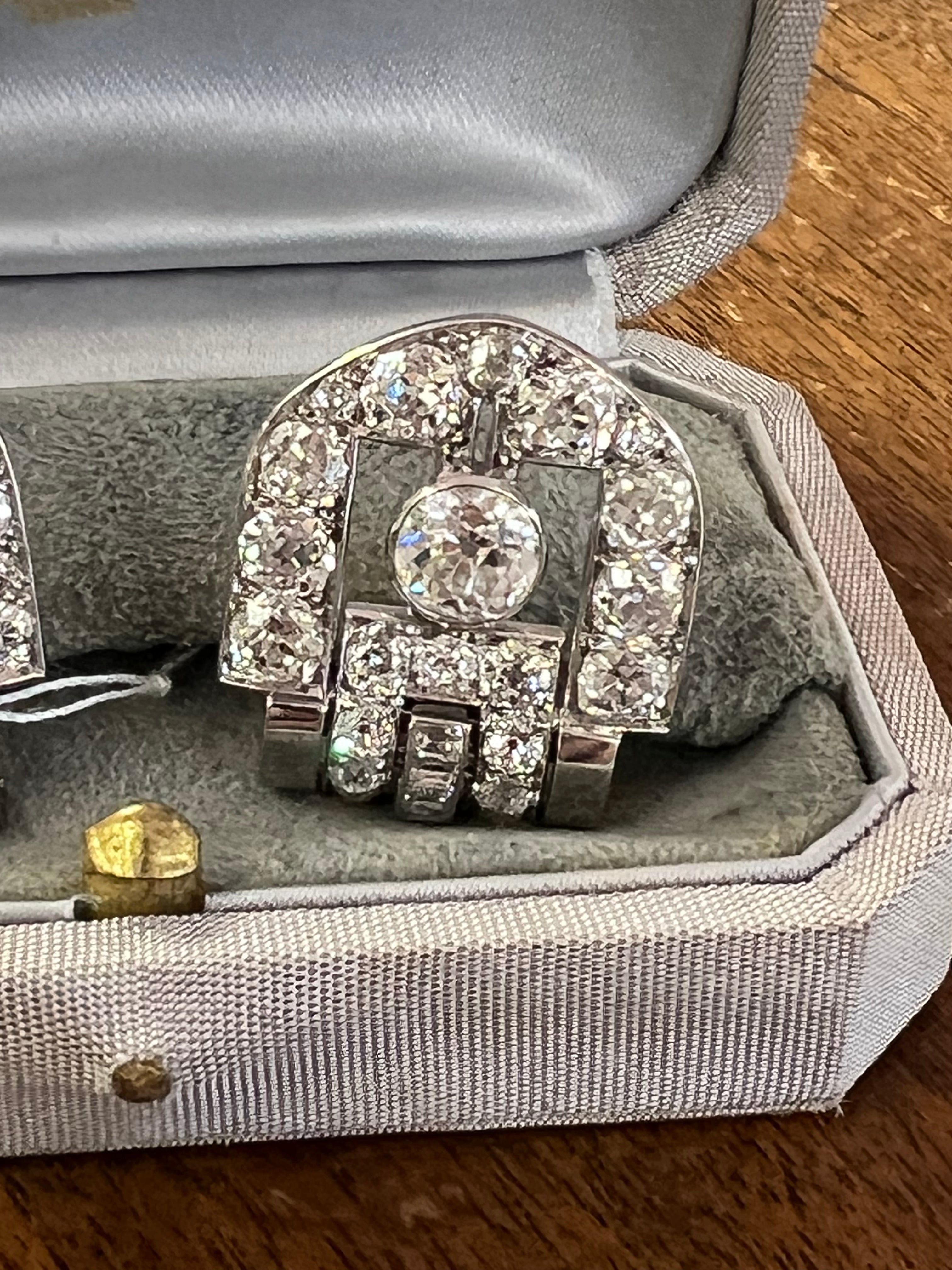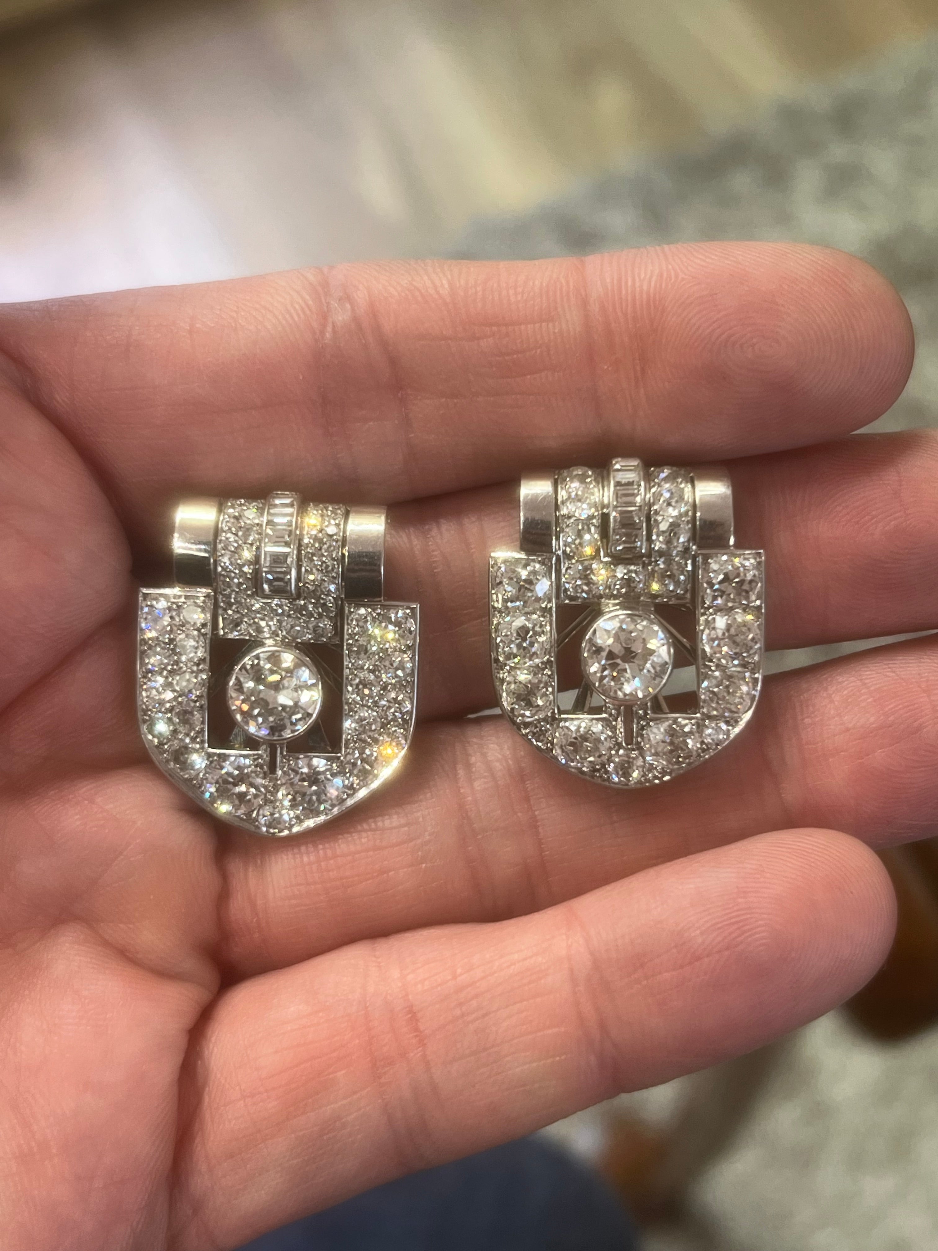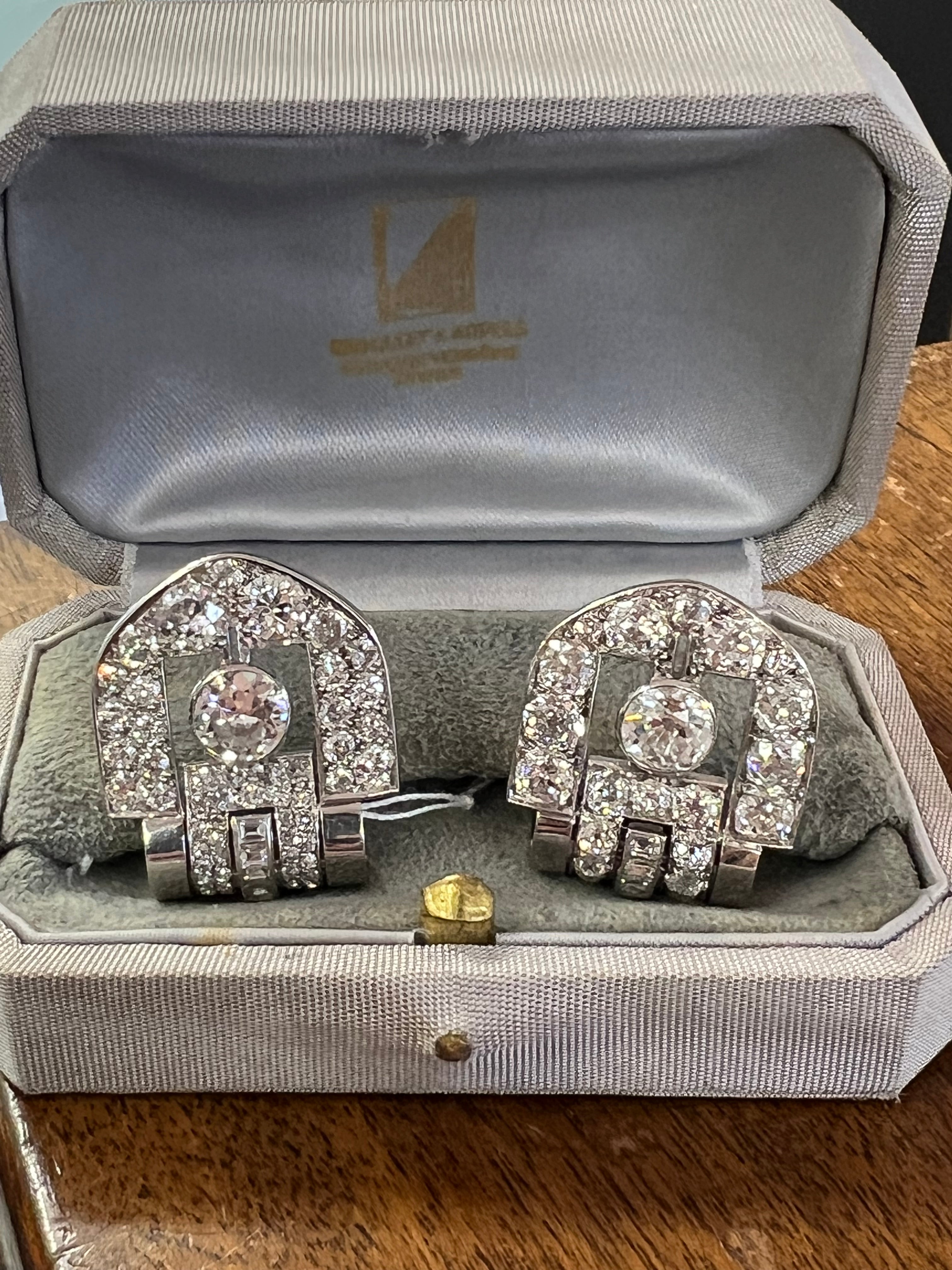 A very beautiful pair of clip brooches, French made circa 1930. Made in platinum and set with approximately 11 Carats diamonds. (6.5+5.5 carats each).