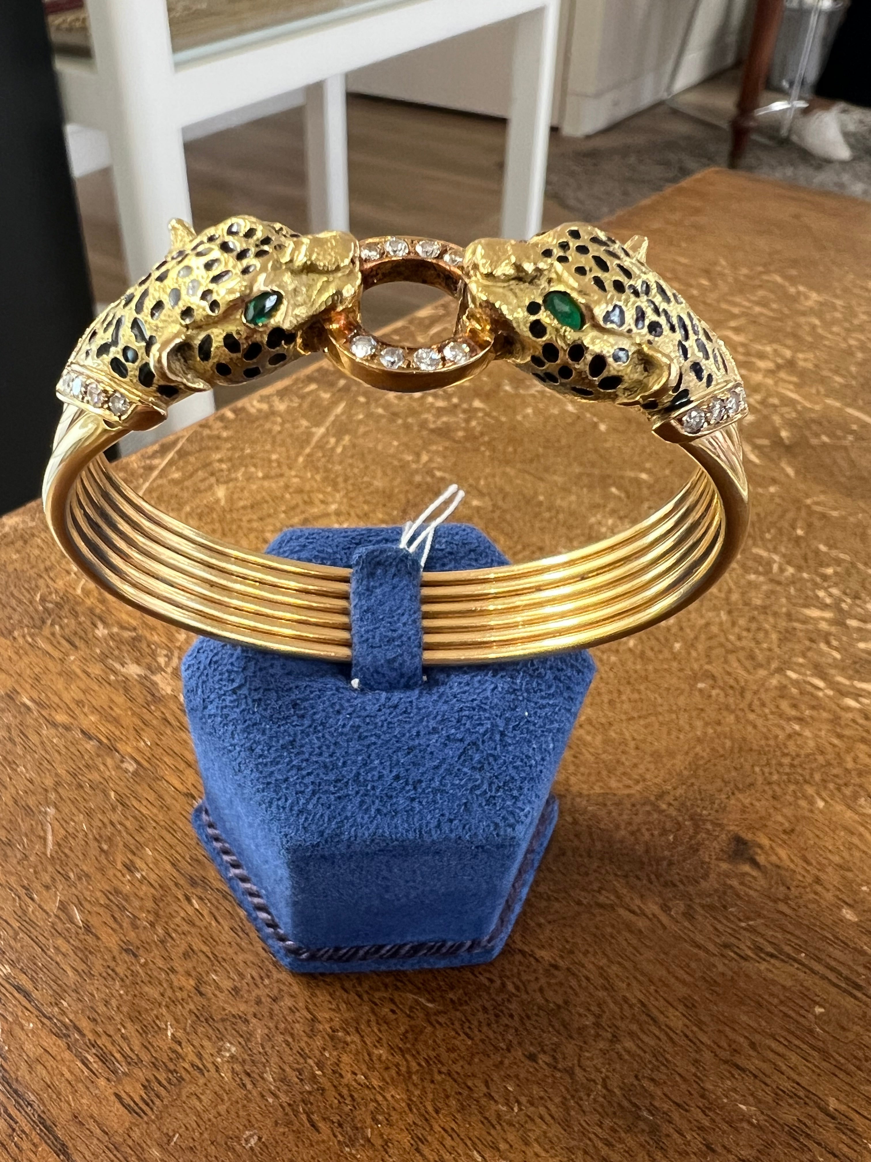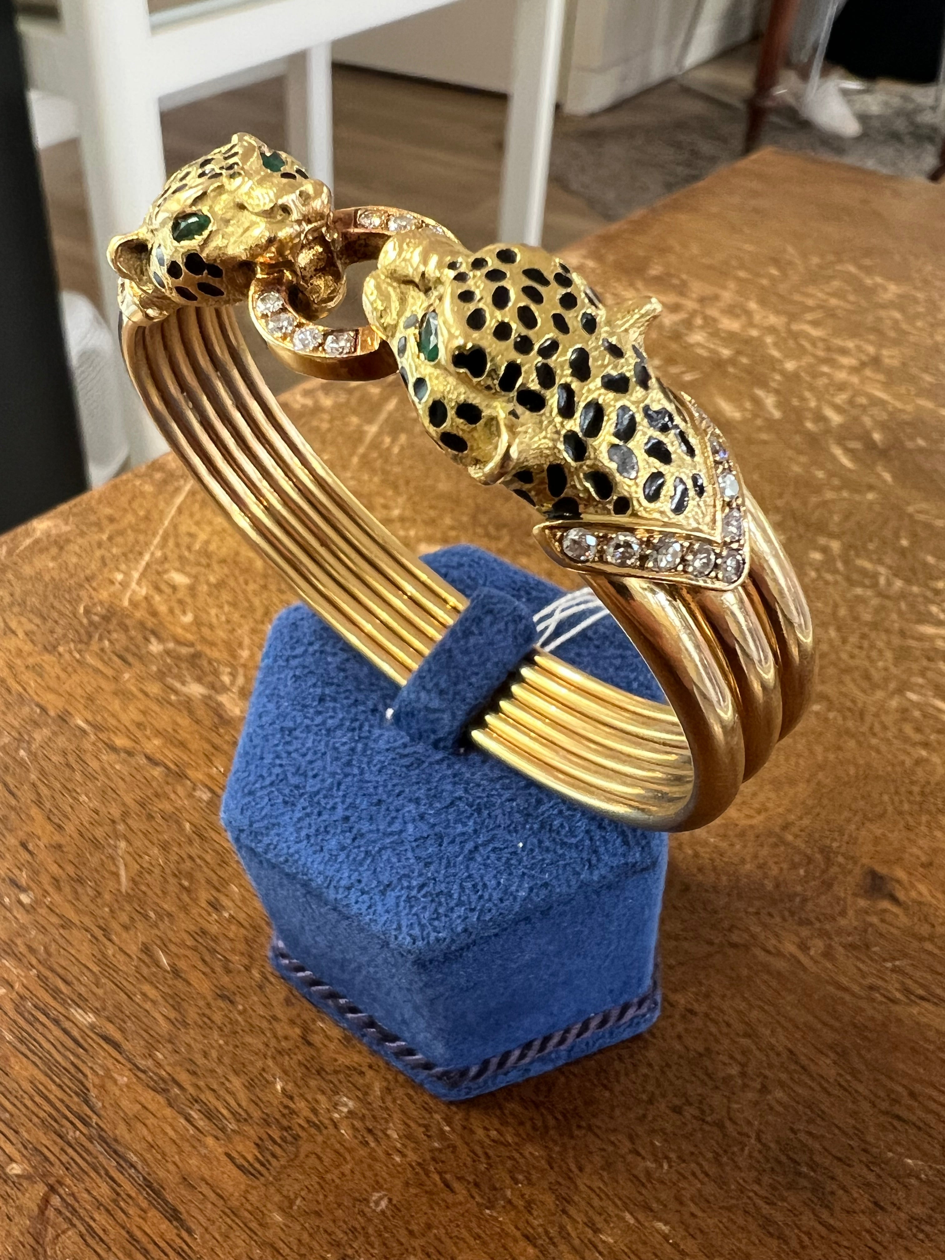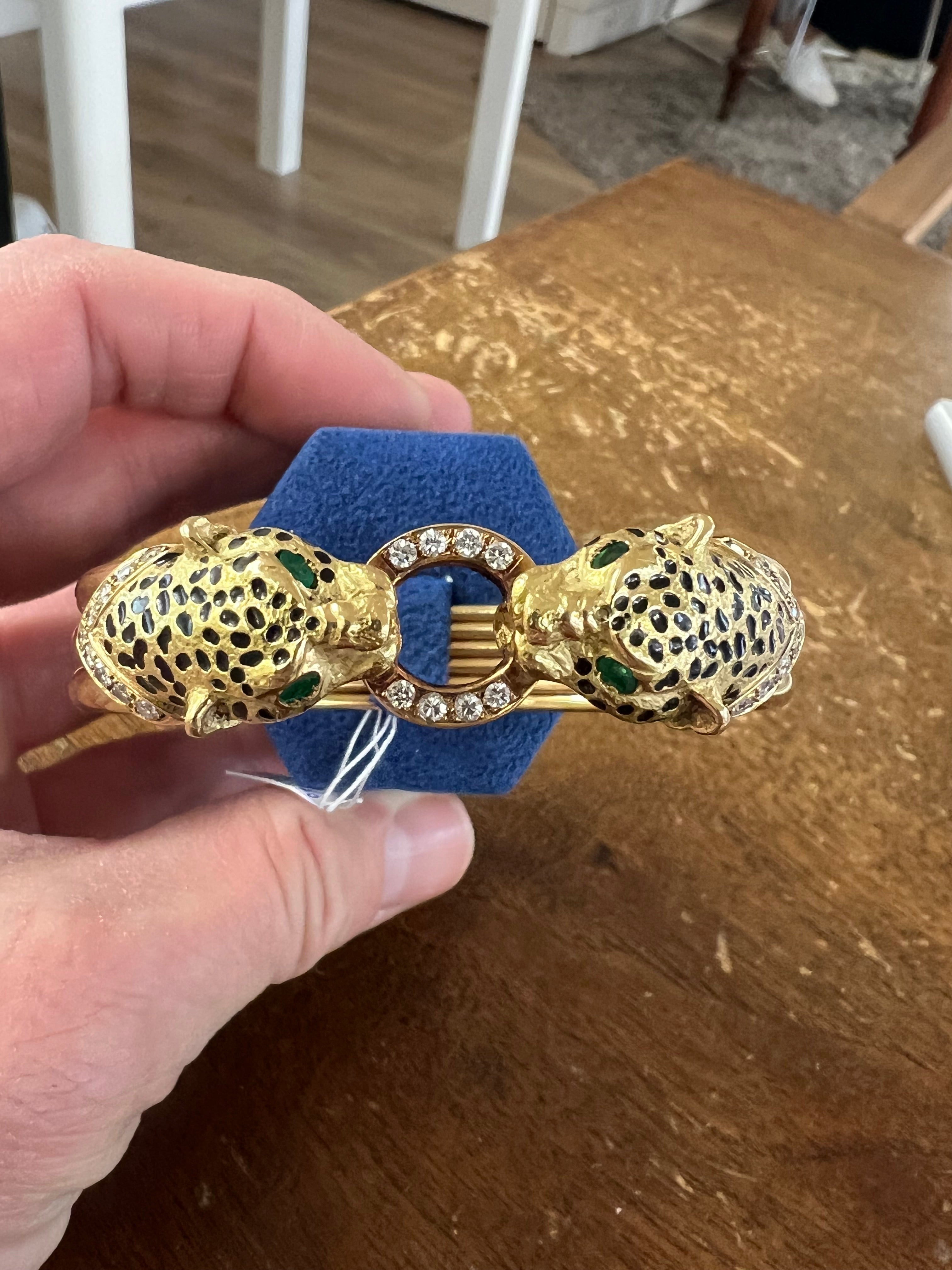It represents two panthers head. Set with diamonds and emeralds, black enamel.