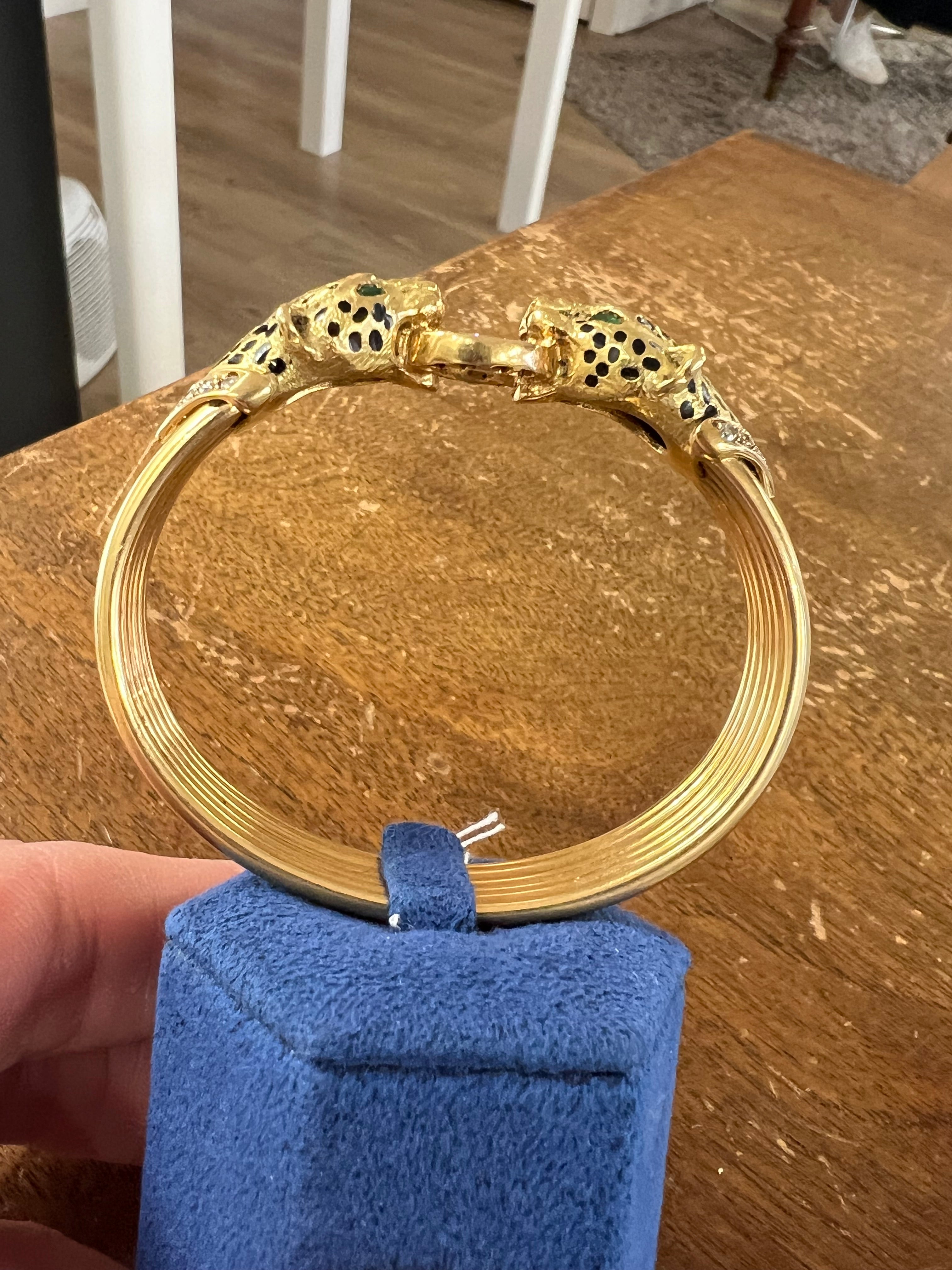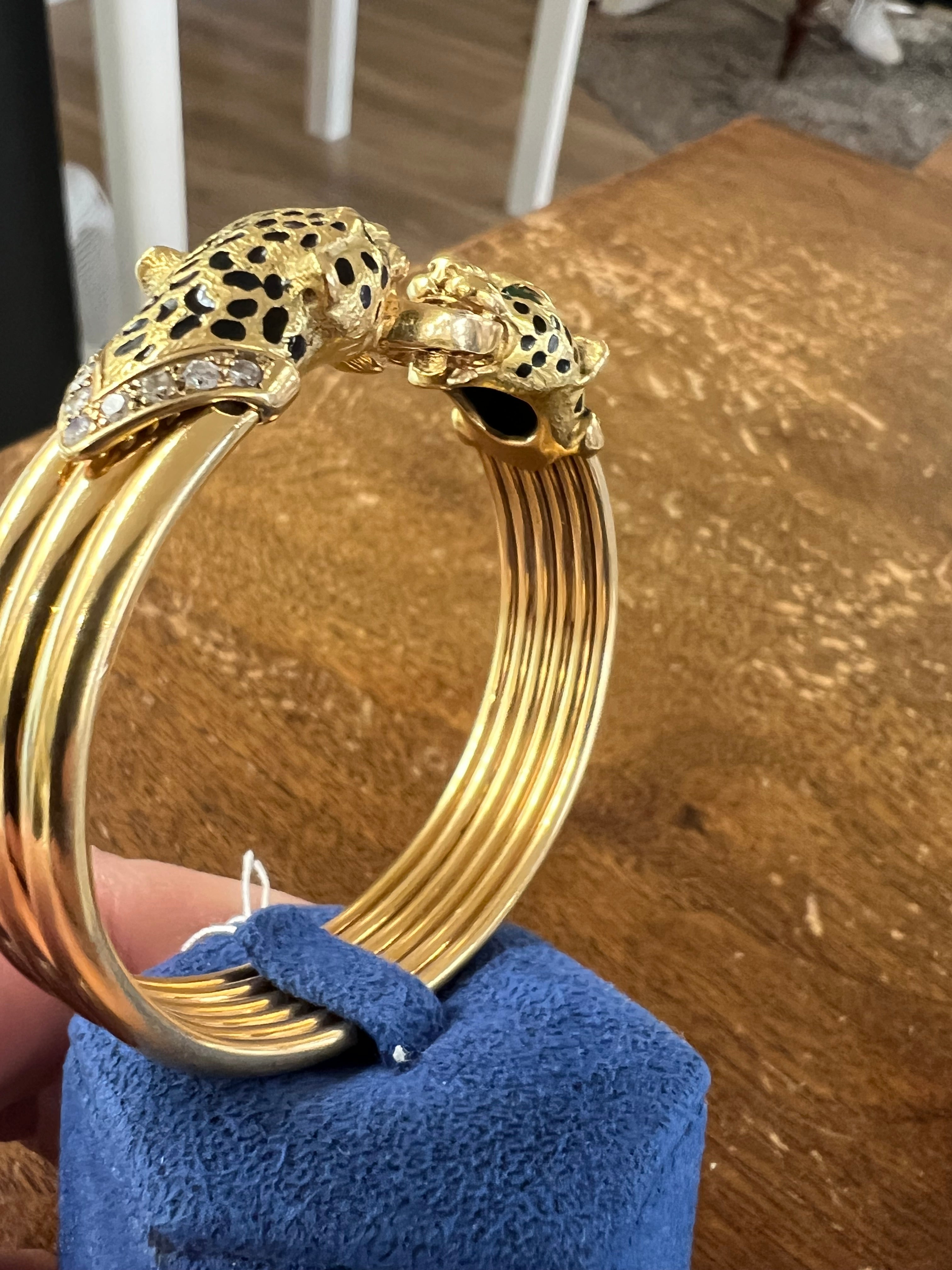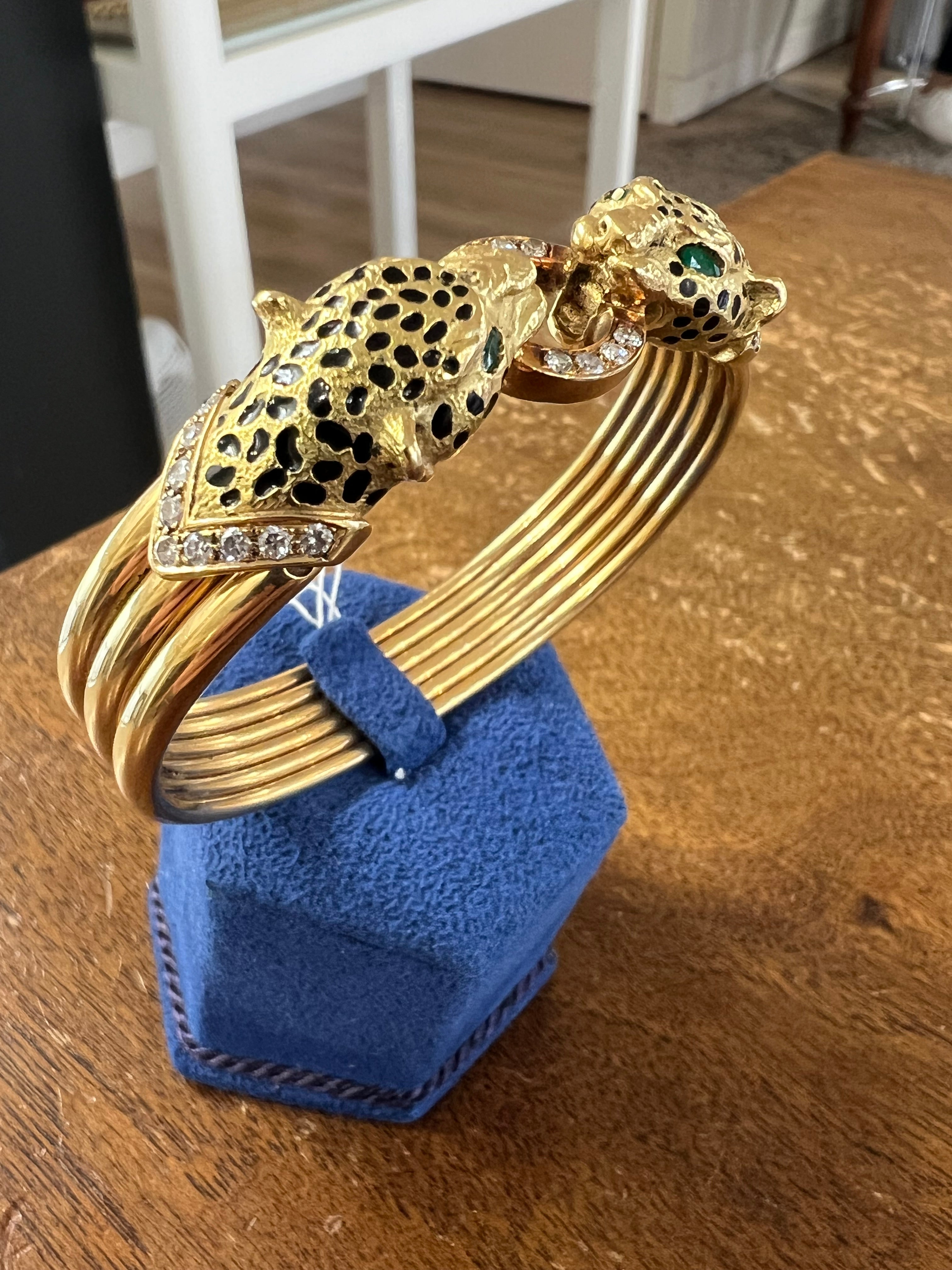 It represents two panthers head. Set with diamonds and emeralds, black enamel.