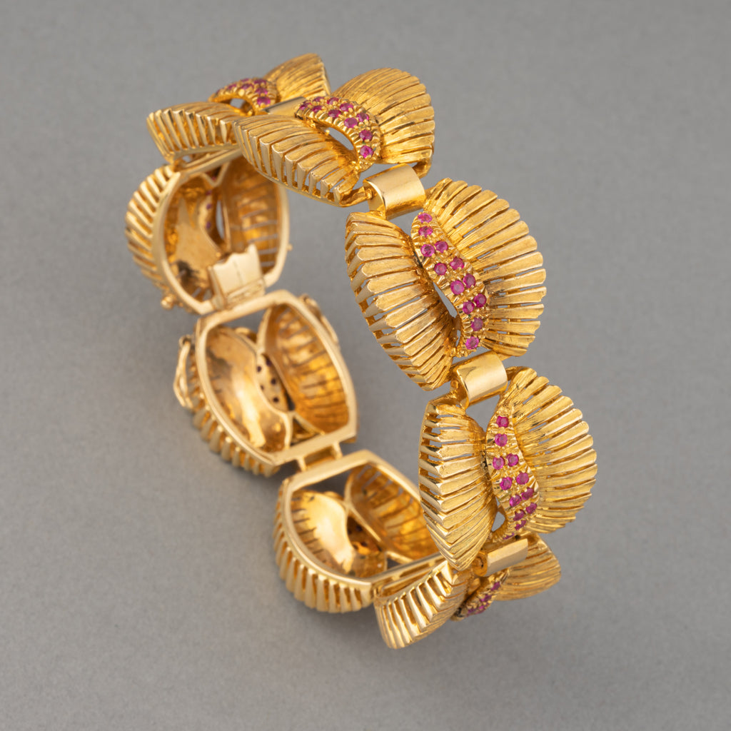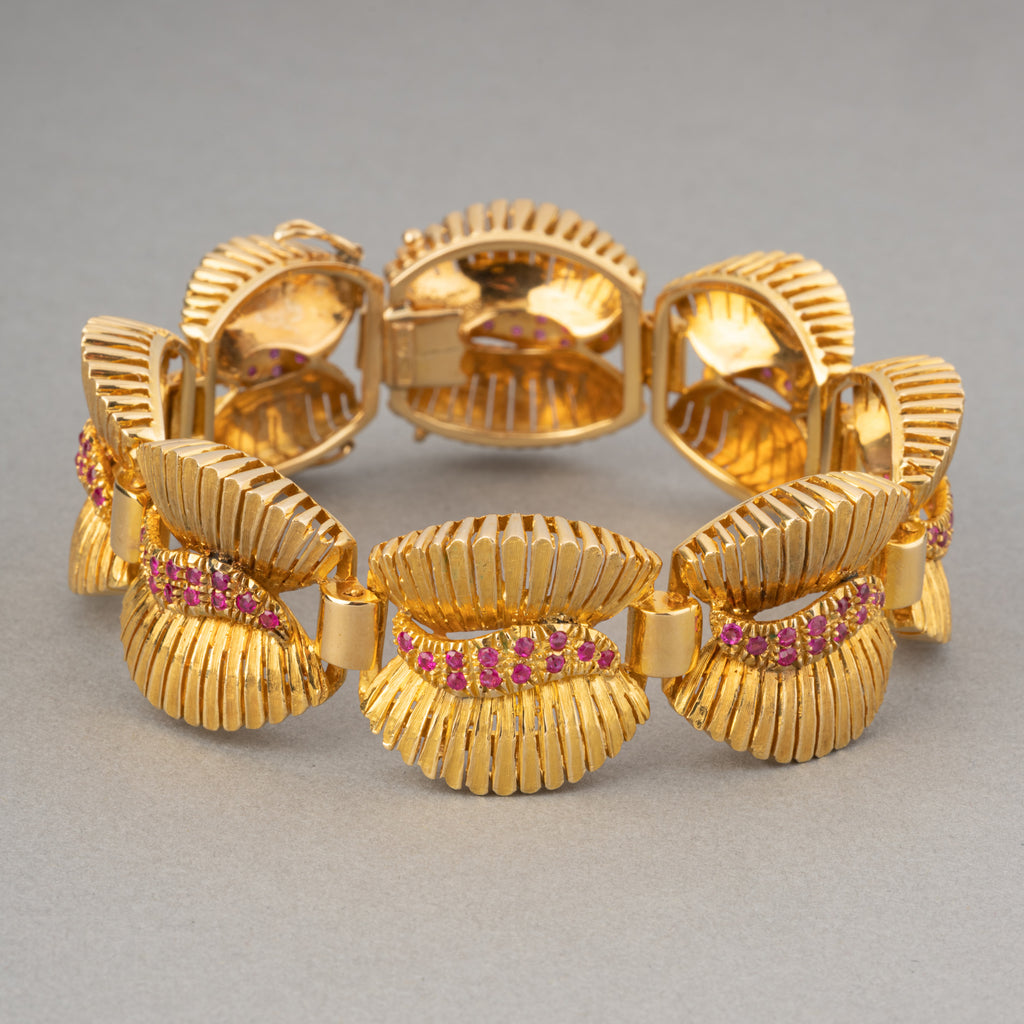 A lovely vintage bracelet, made circa 1960. Italian made Made in yellow gold 18k, set with rubies.