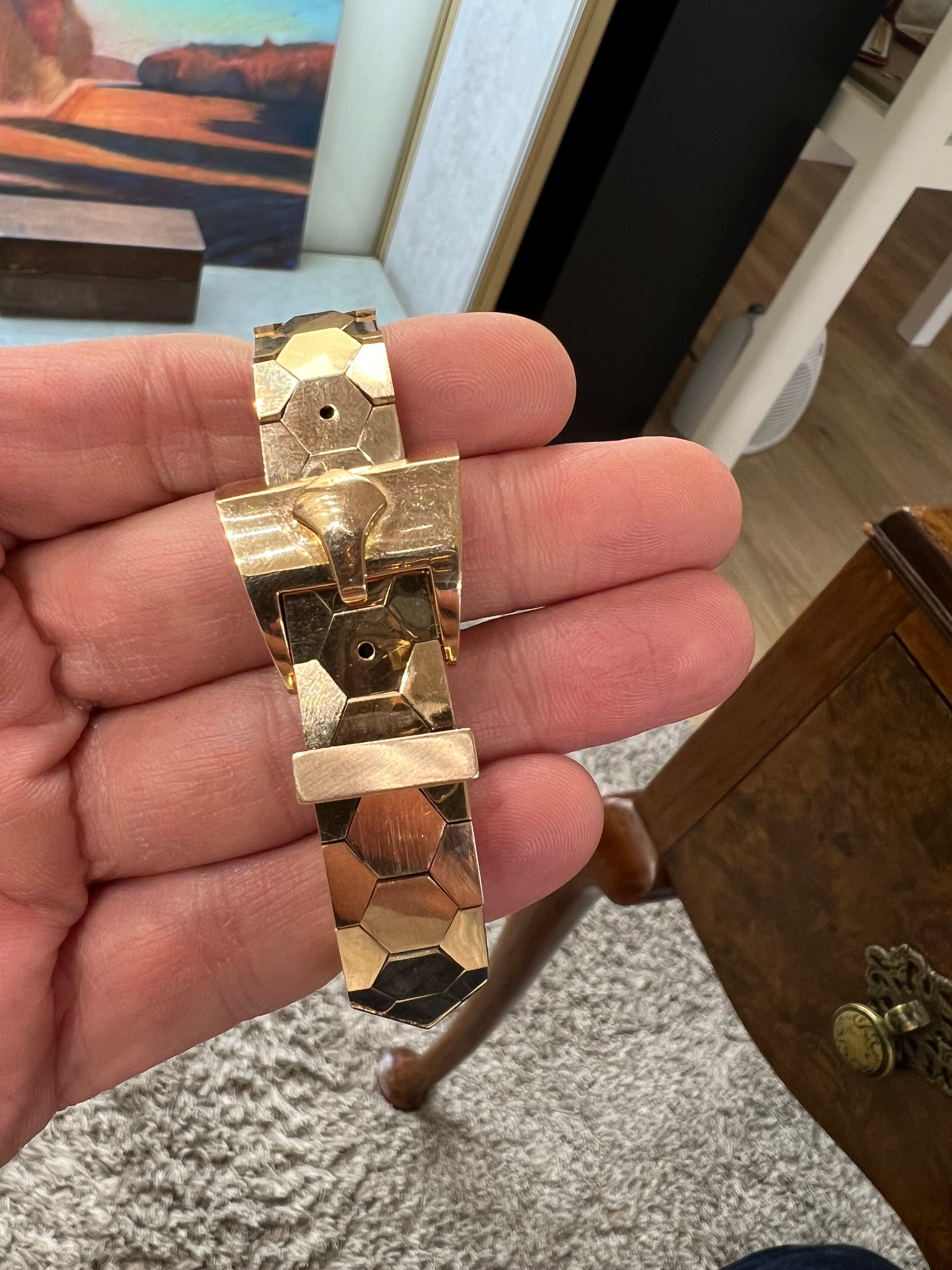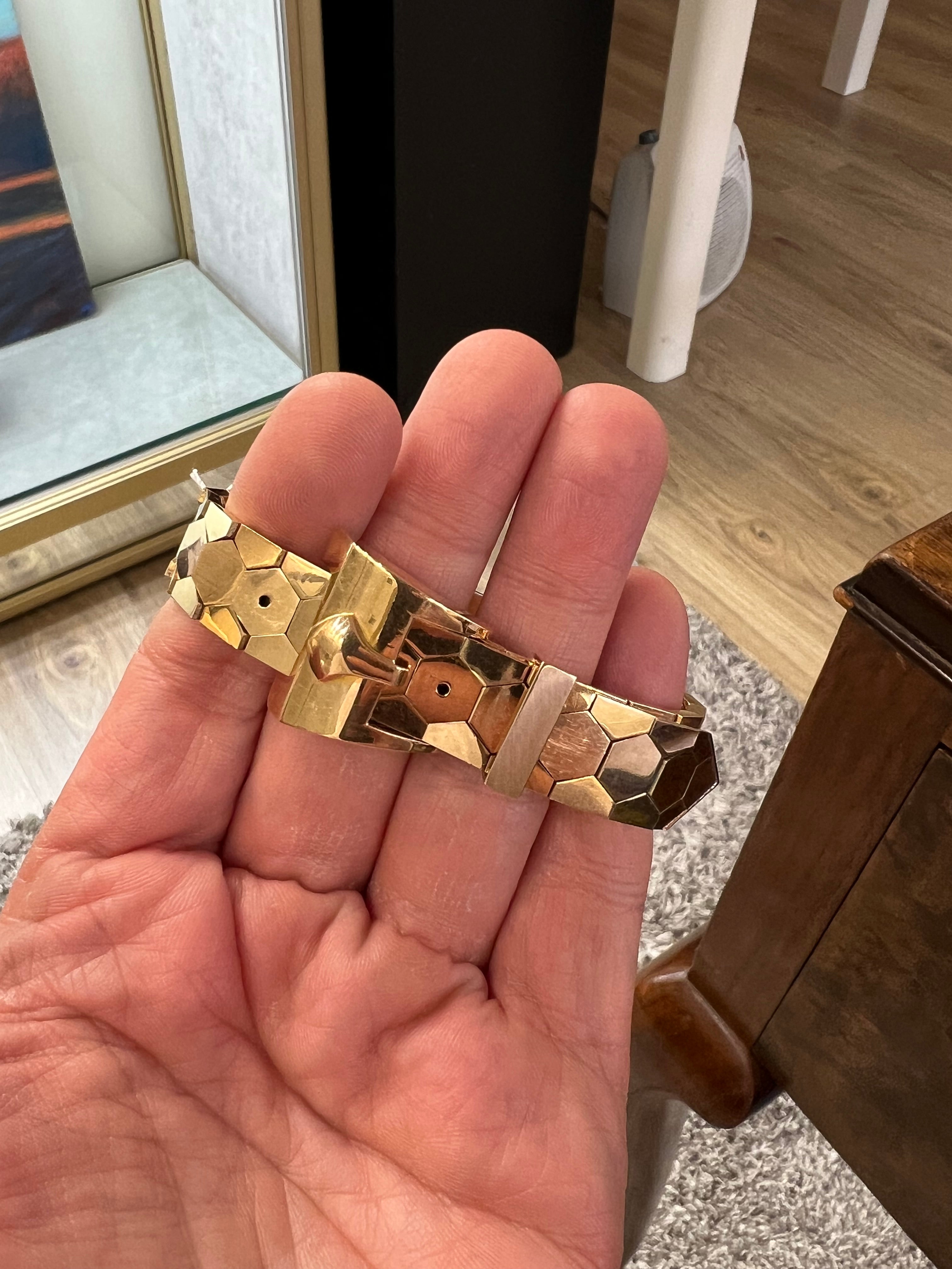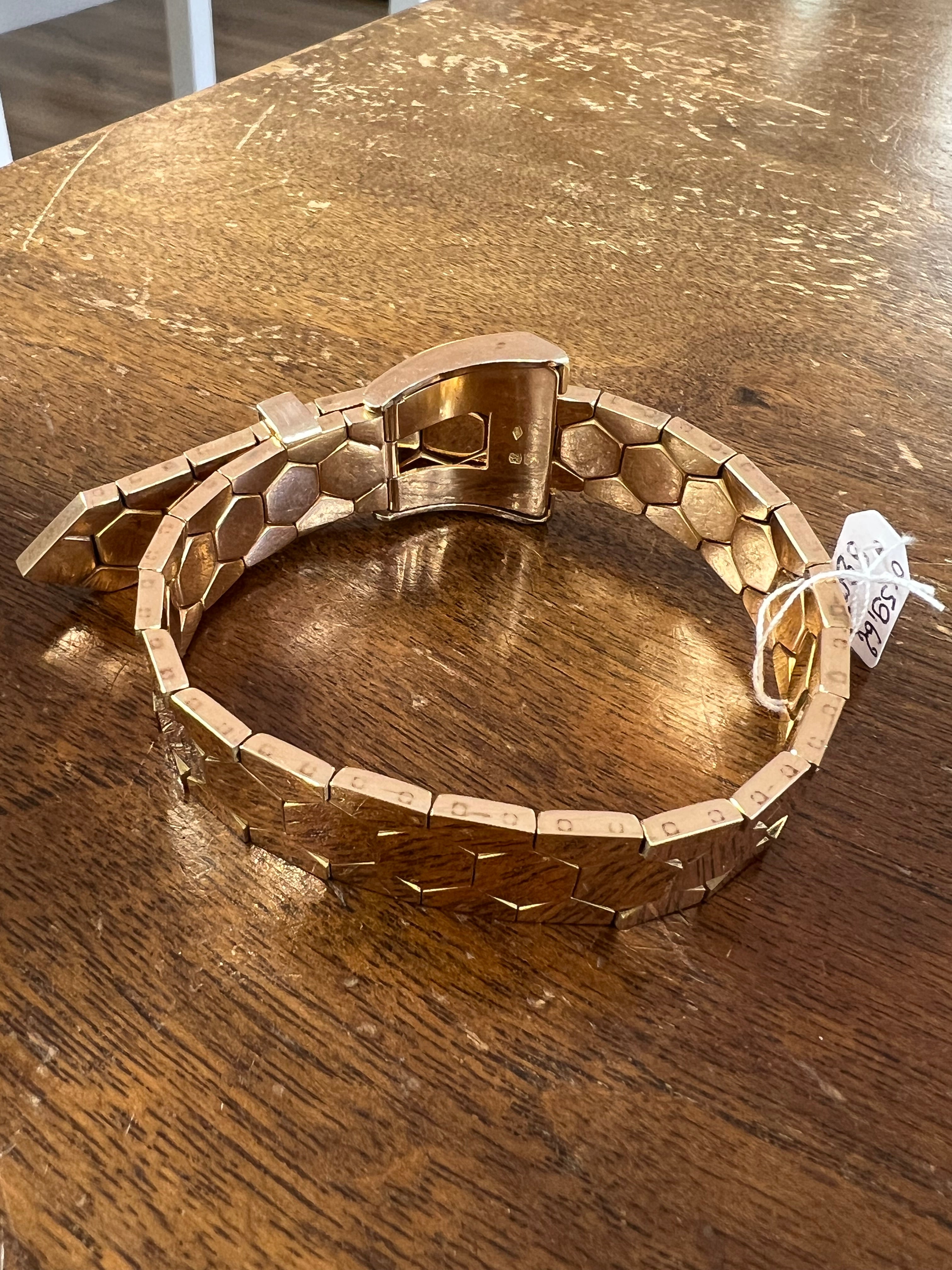 Made in gold 18K, it weights 59.62 grams. The size is for 16 to 18.5 cm wrist. Hallmarls for gold and maker.