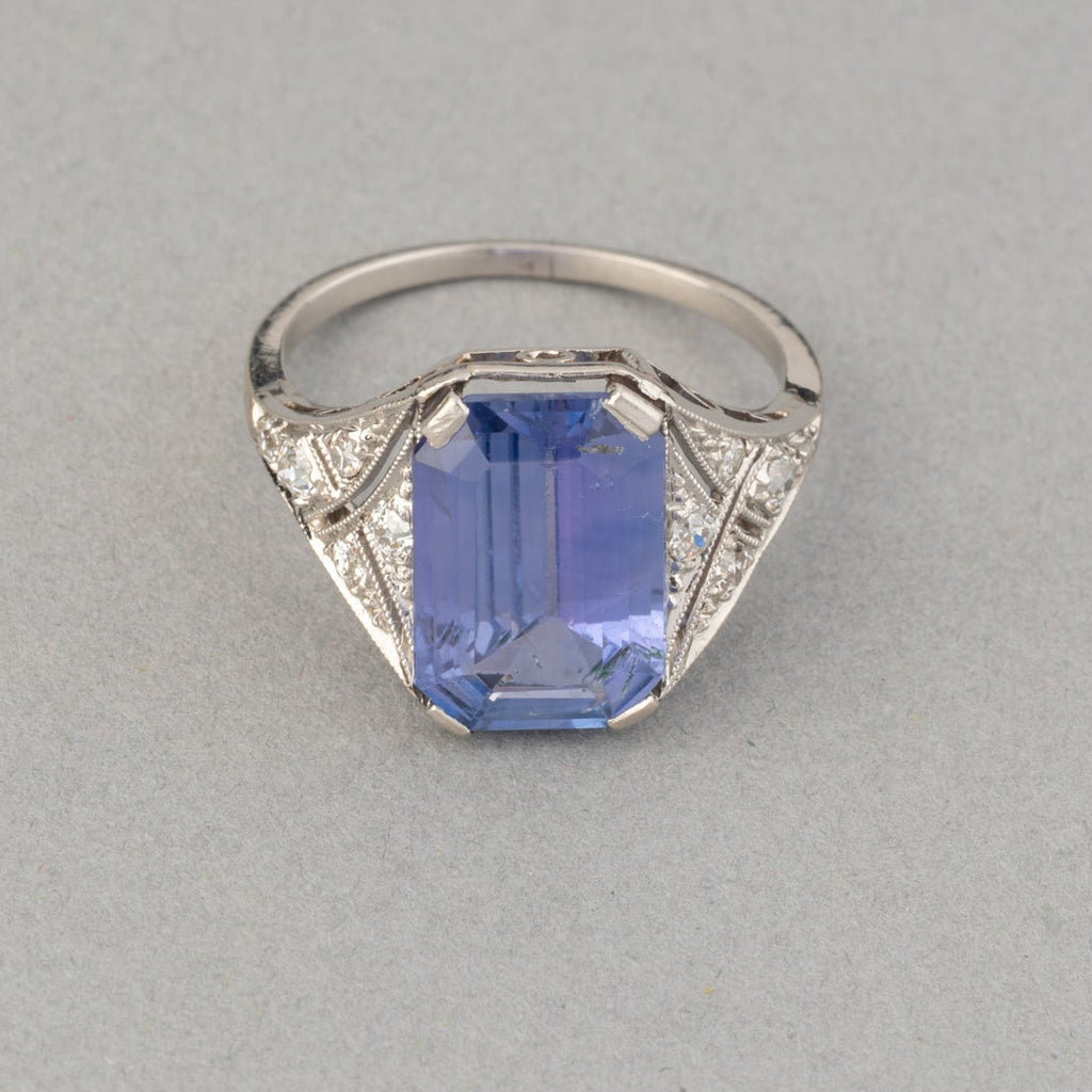 Gold Platinum and 5 Carats Certified Ceylon sapphire Art Deco Ring