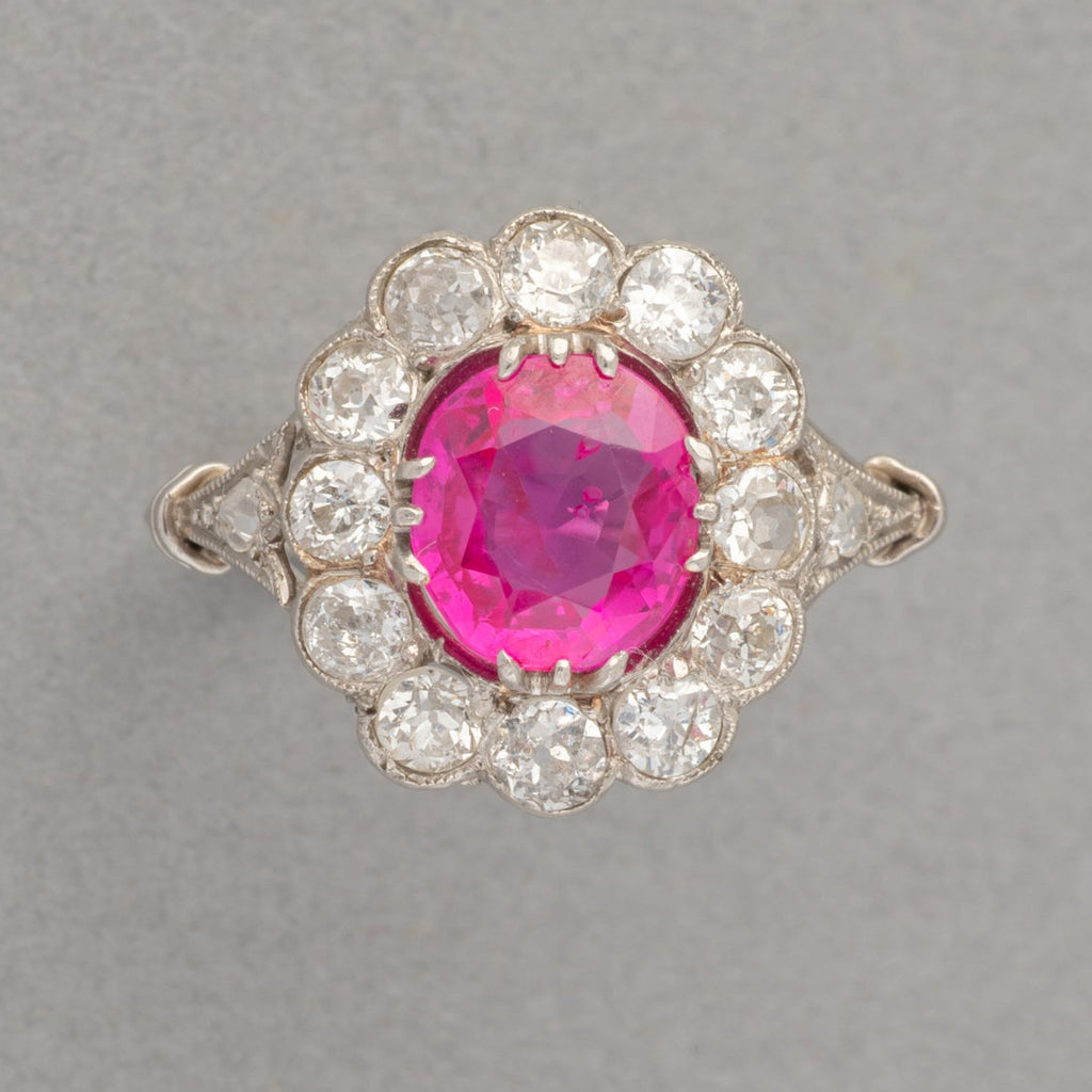 Platinum Diamonds and Certified 2.40 Carats Burma Ruby Antique Ring