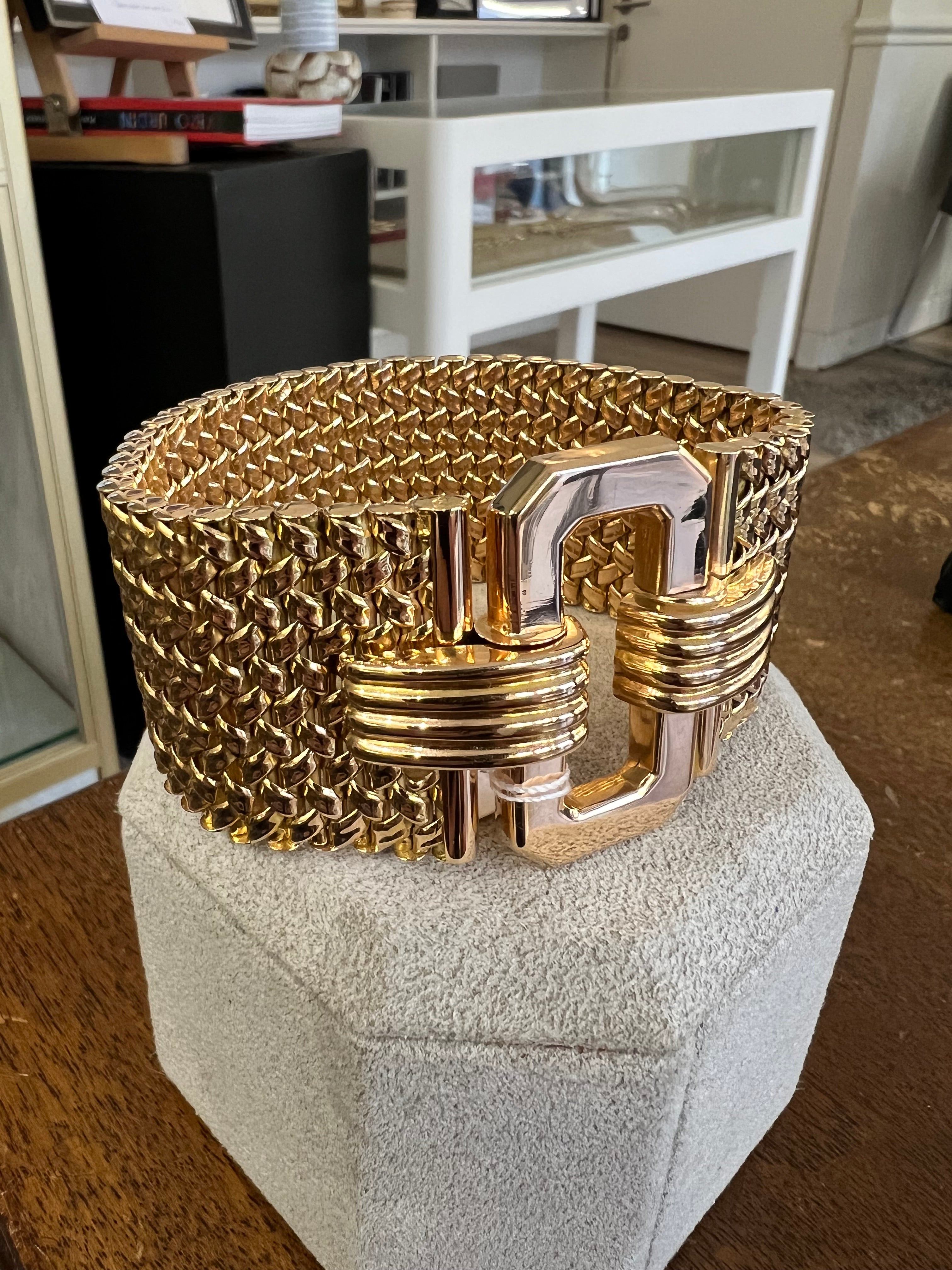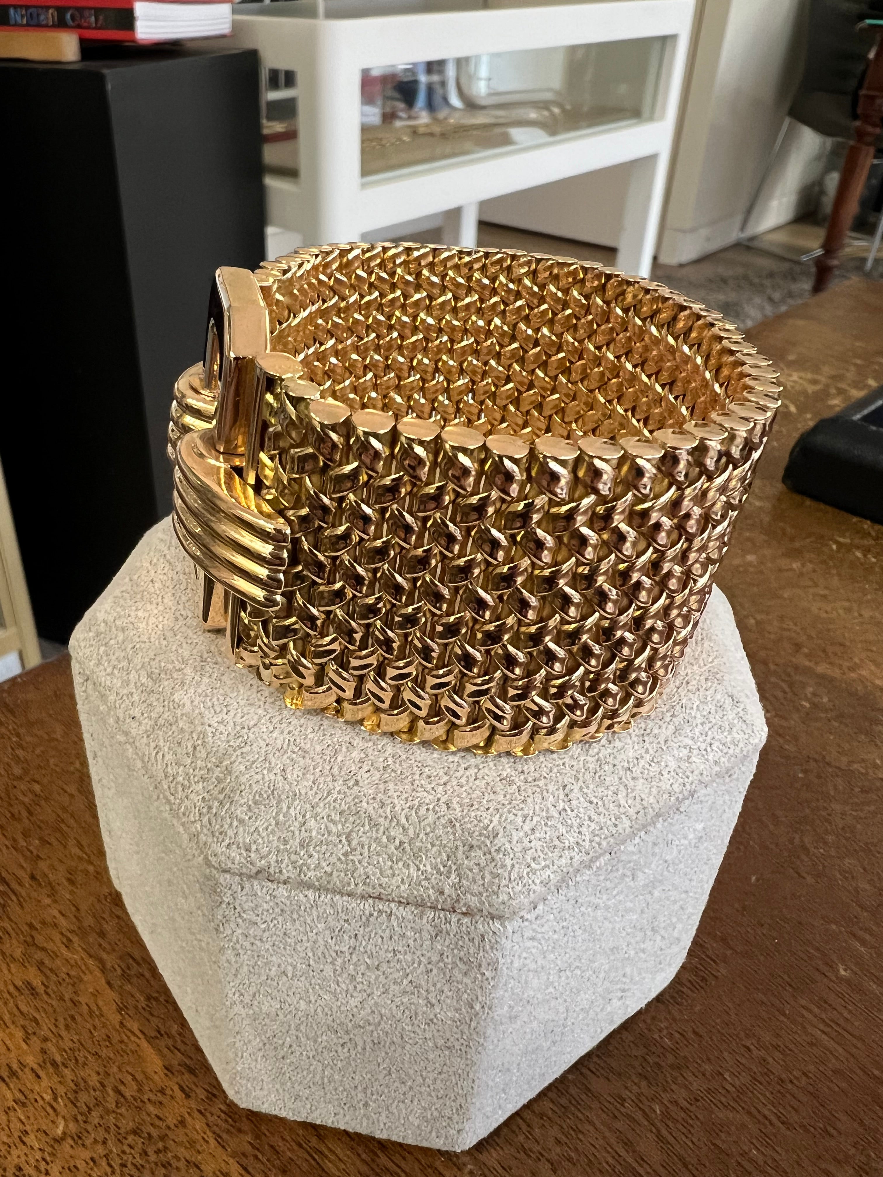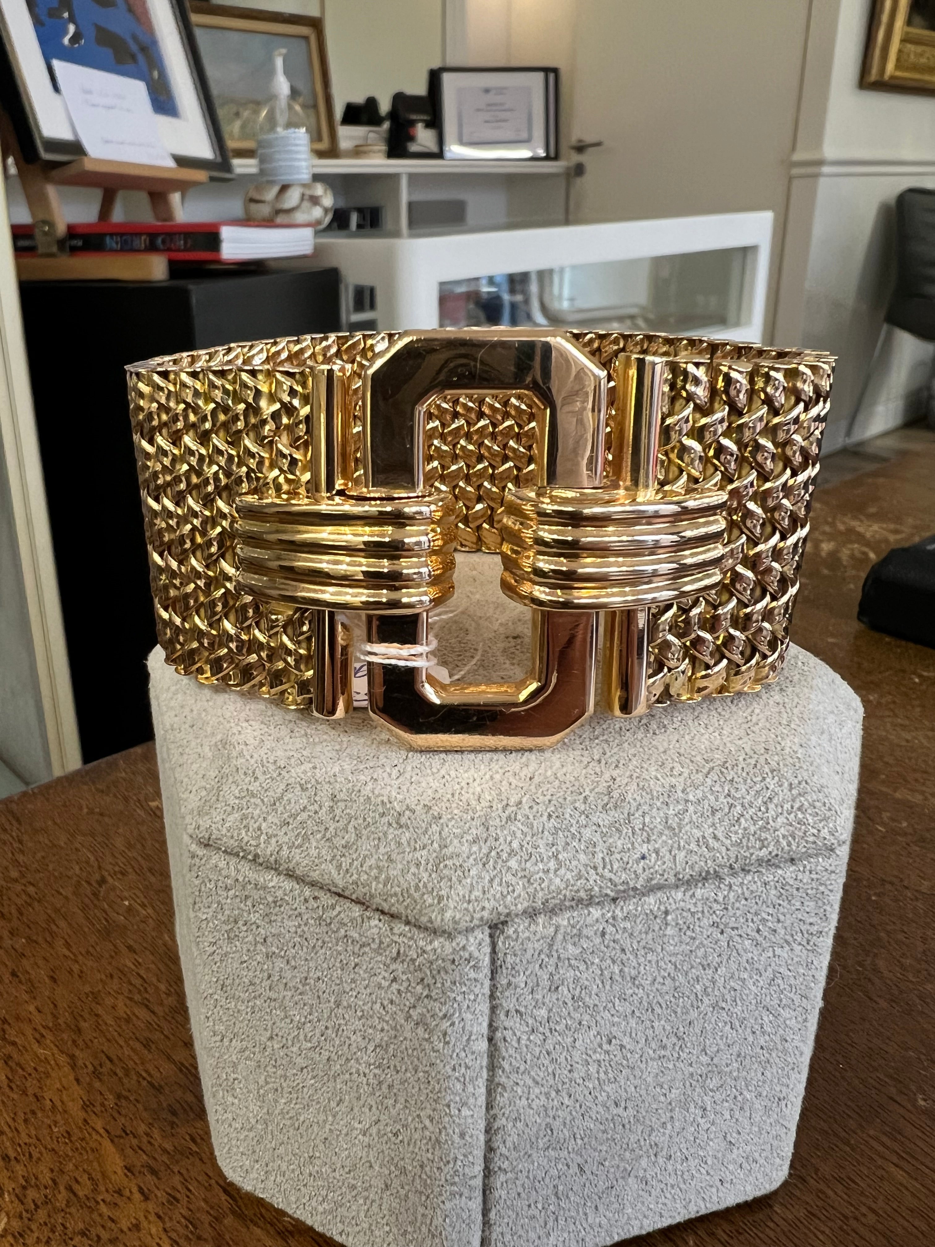 A beautiful French bracelet, made circa 1950. Made in yellow gold 18k, it weights 91.45 grams. The length is 20cm. The width is 35 and 40mm.