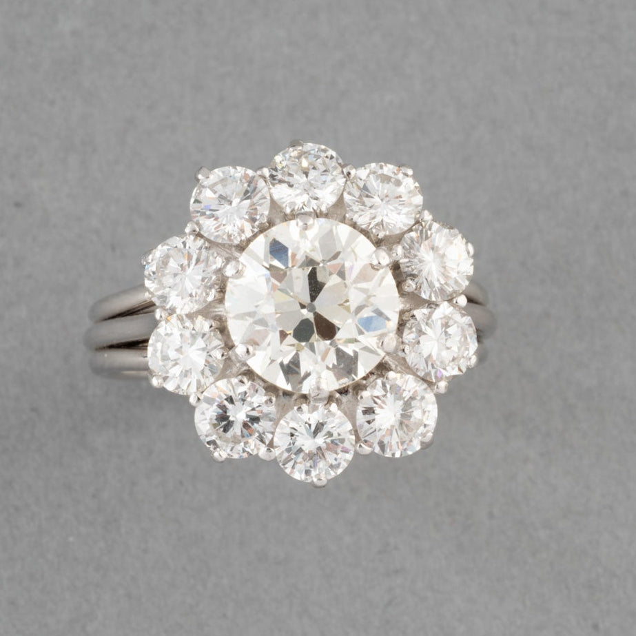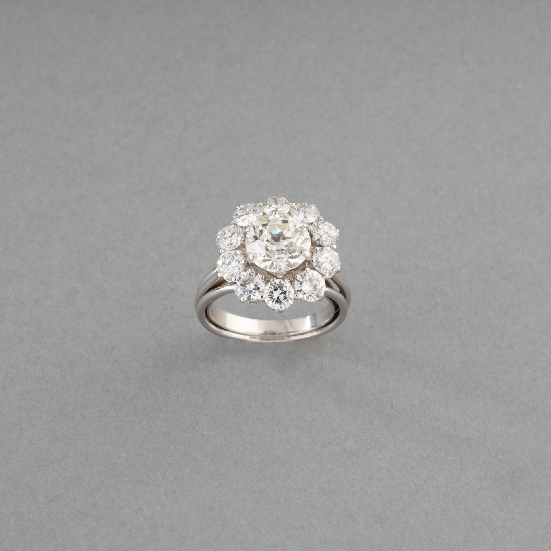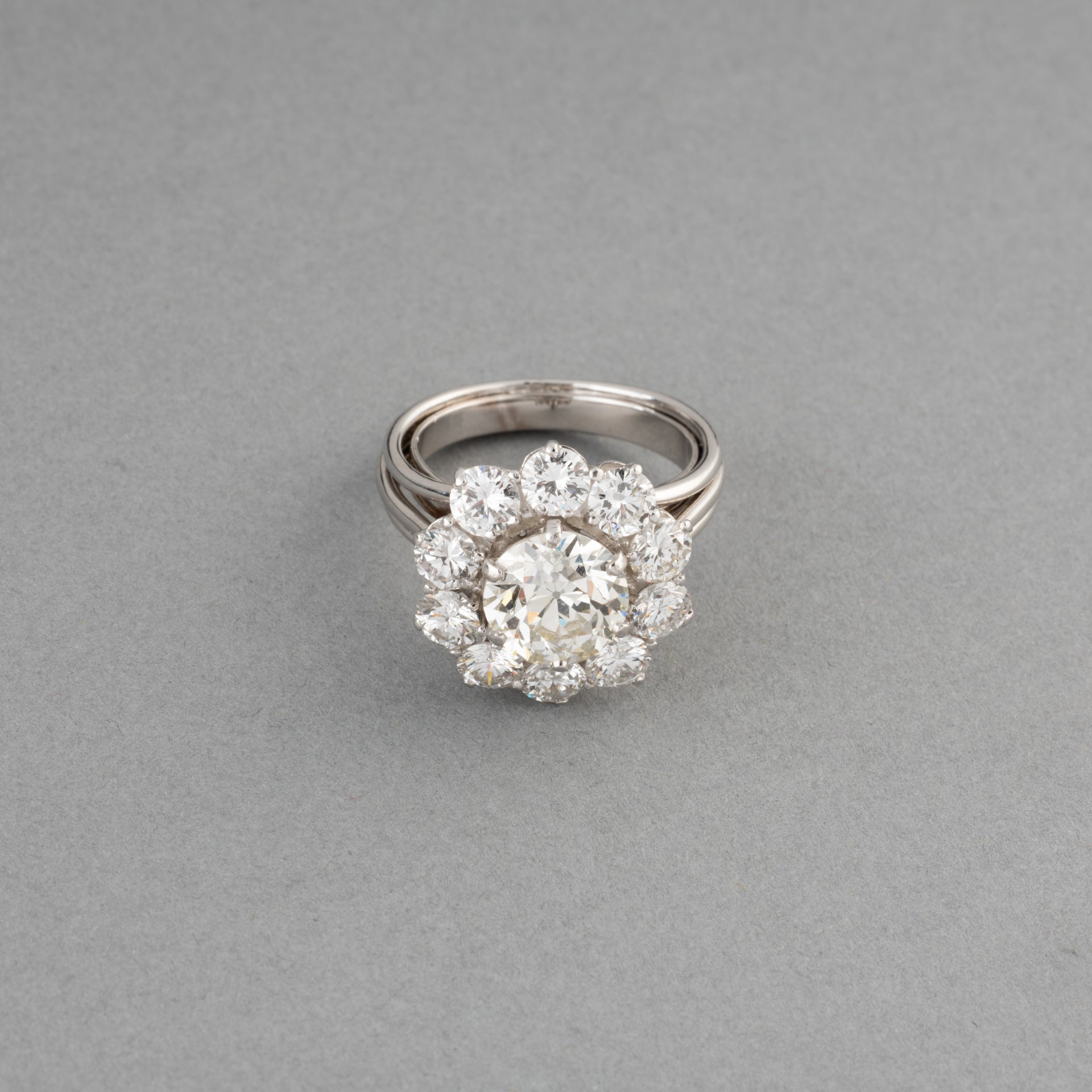 Made in white gold 18k. Set with a central round diamond that weights exactly 2.81 carats. Surround by 10 brillant cut diamonds for approximately 2.50 carats diamonds.