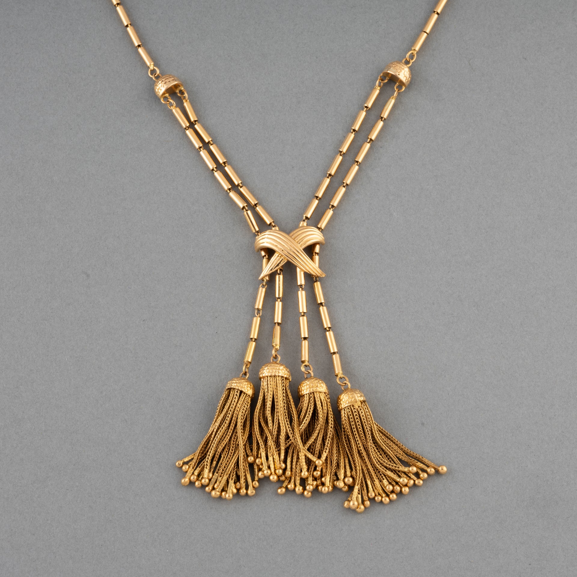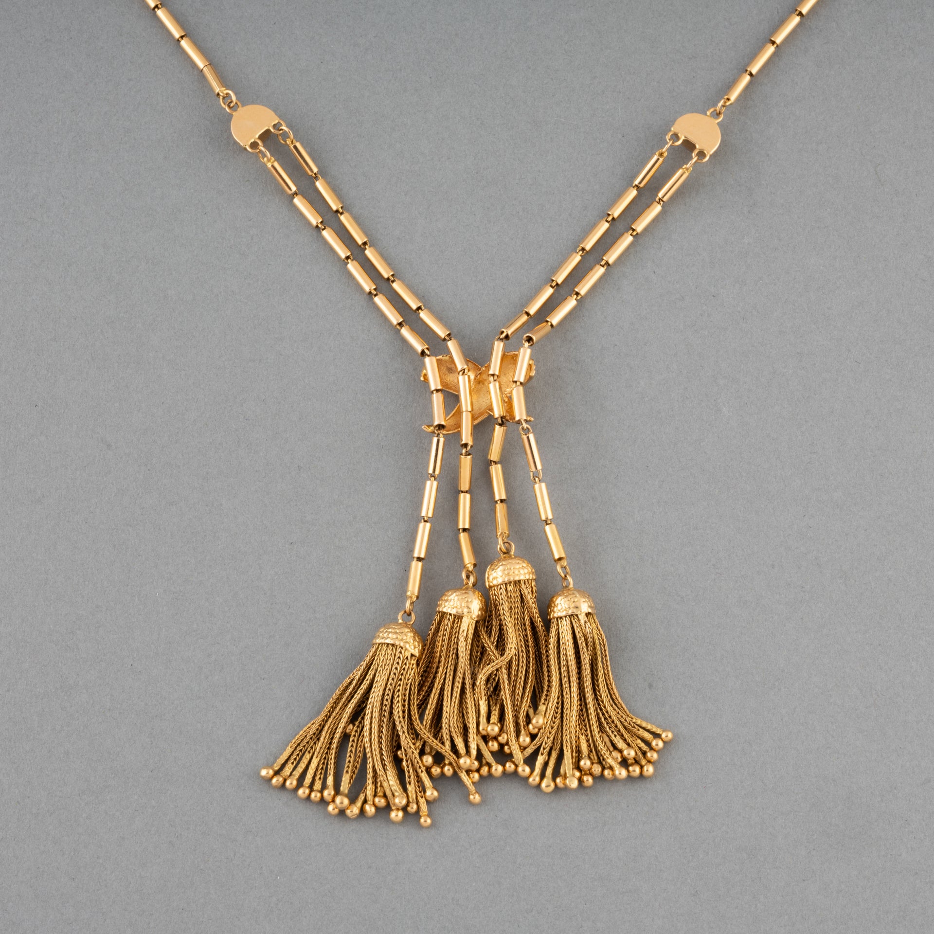 Made in yellow gold 18k. With four tassels as a pendant. The tassels part measures 7.5 cm or 3 inches.