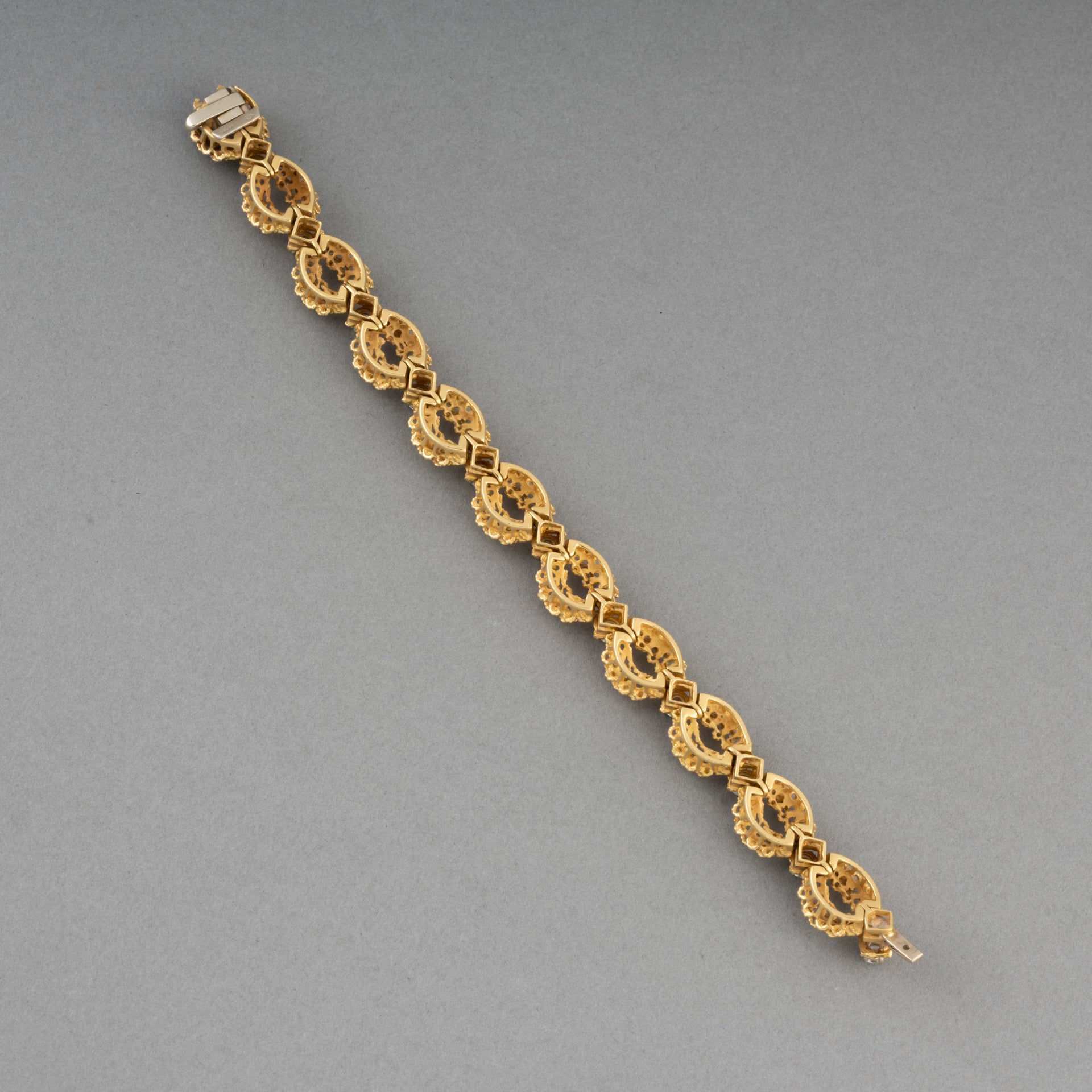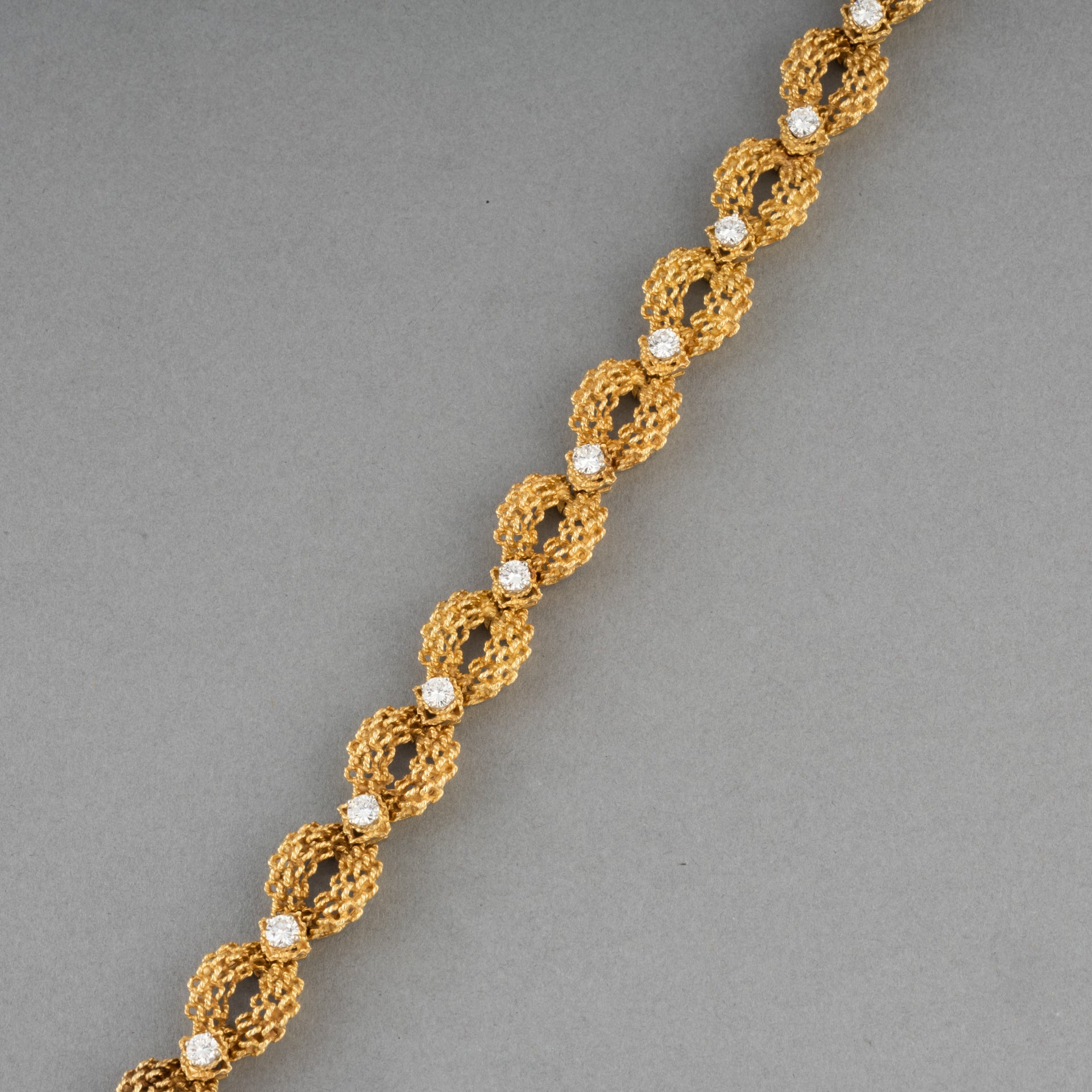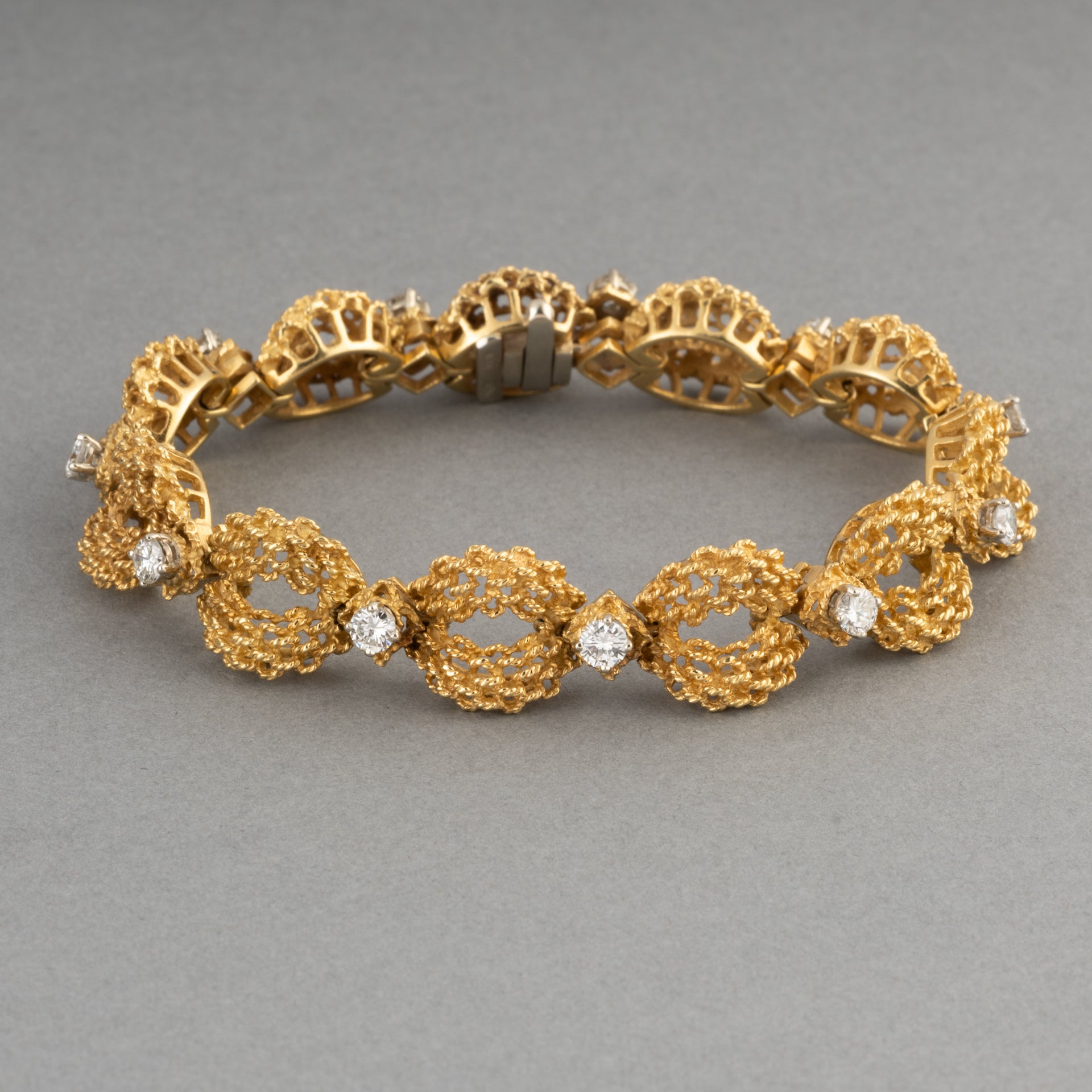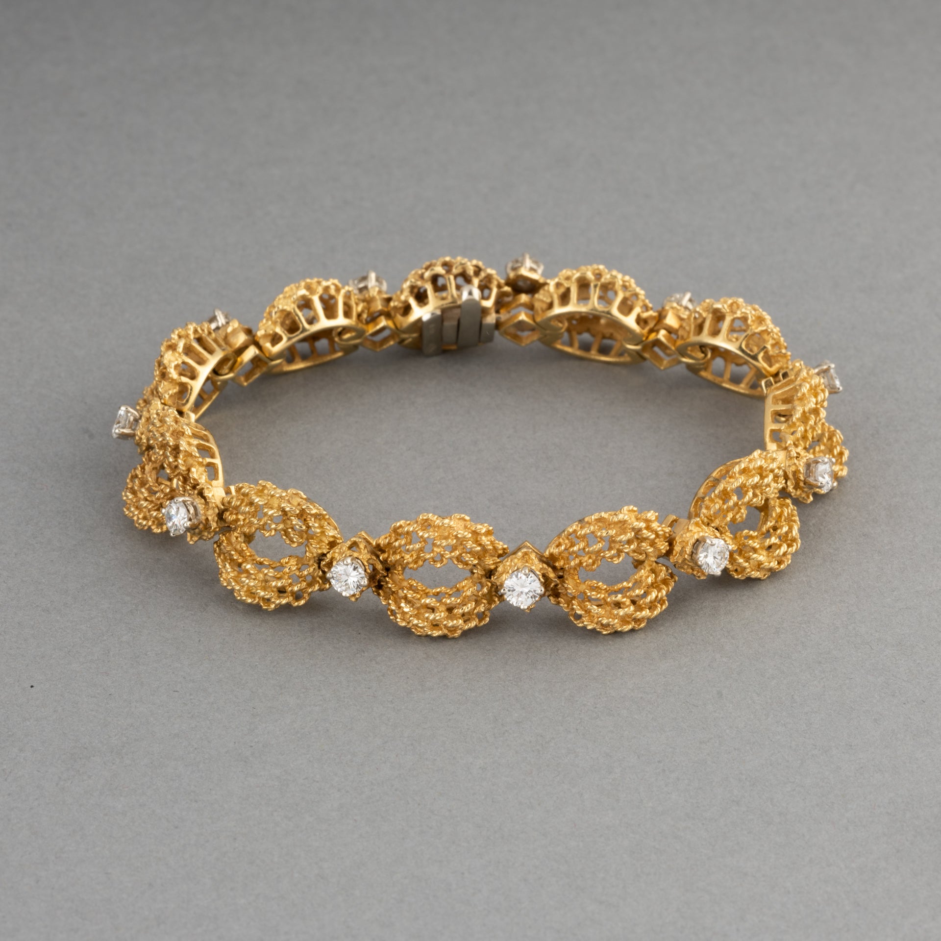 A lovely vintage bracelet, made circa 1970. Made in yellow gold 18k and set with approximately 1 carat of round brilliant cut diamonds. (10*0.10). The diamonds quality is good.