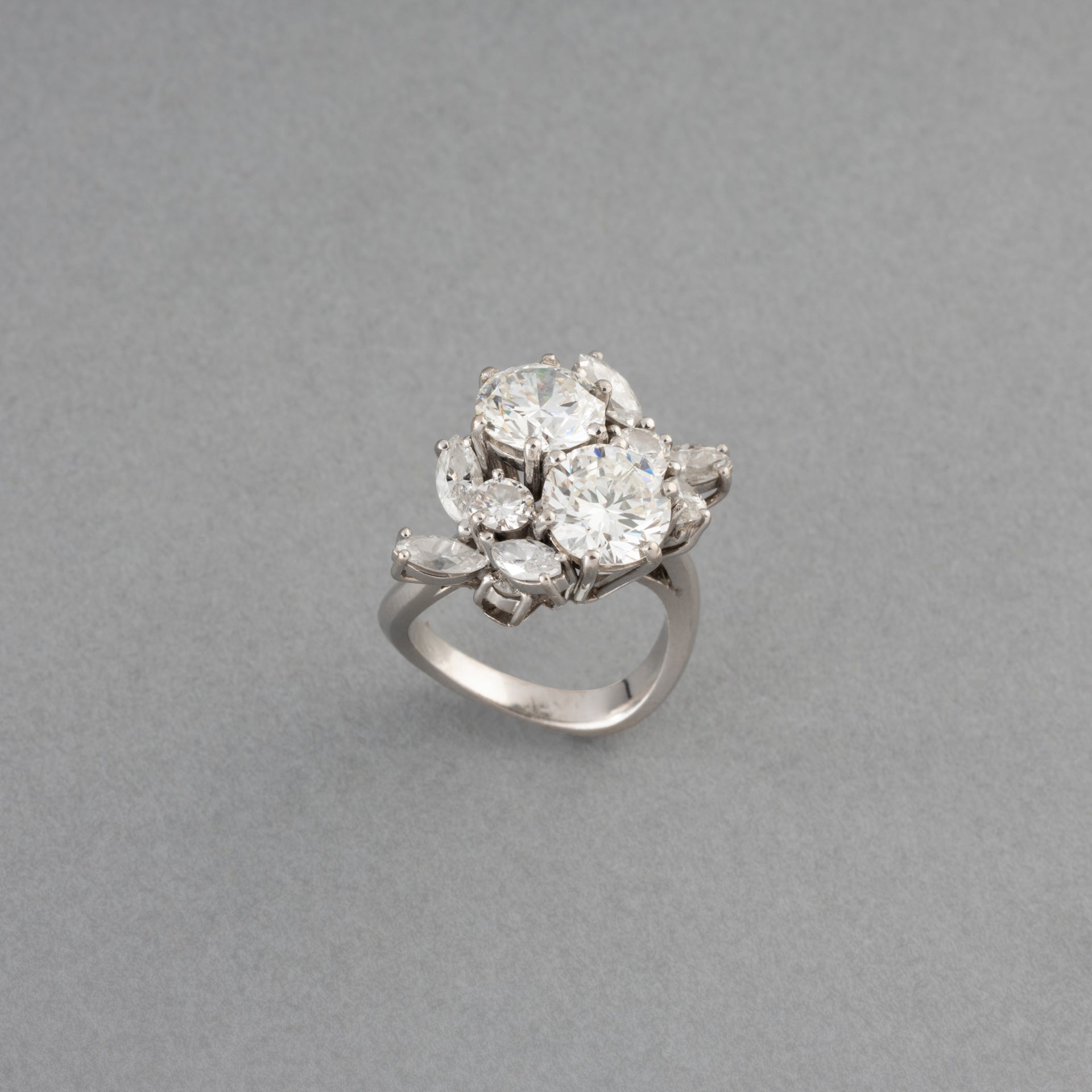 Made in white gold 18k and set with diamonds. The two principal round brilliant cut diamonds weights exactly 1.76 and 1.77 carats. The diamonds are of good quality.